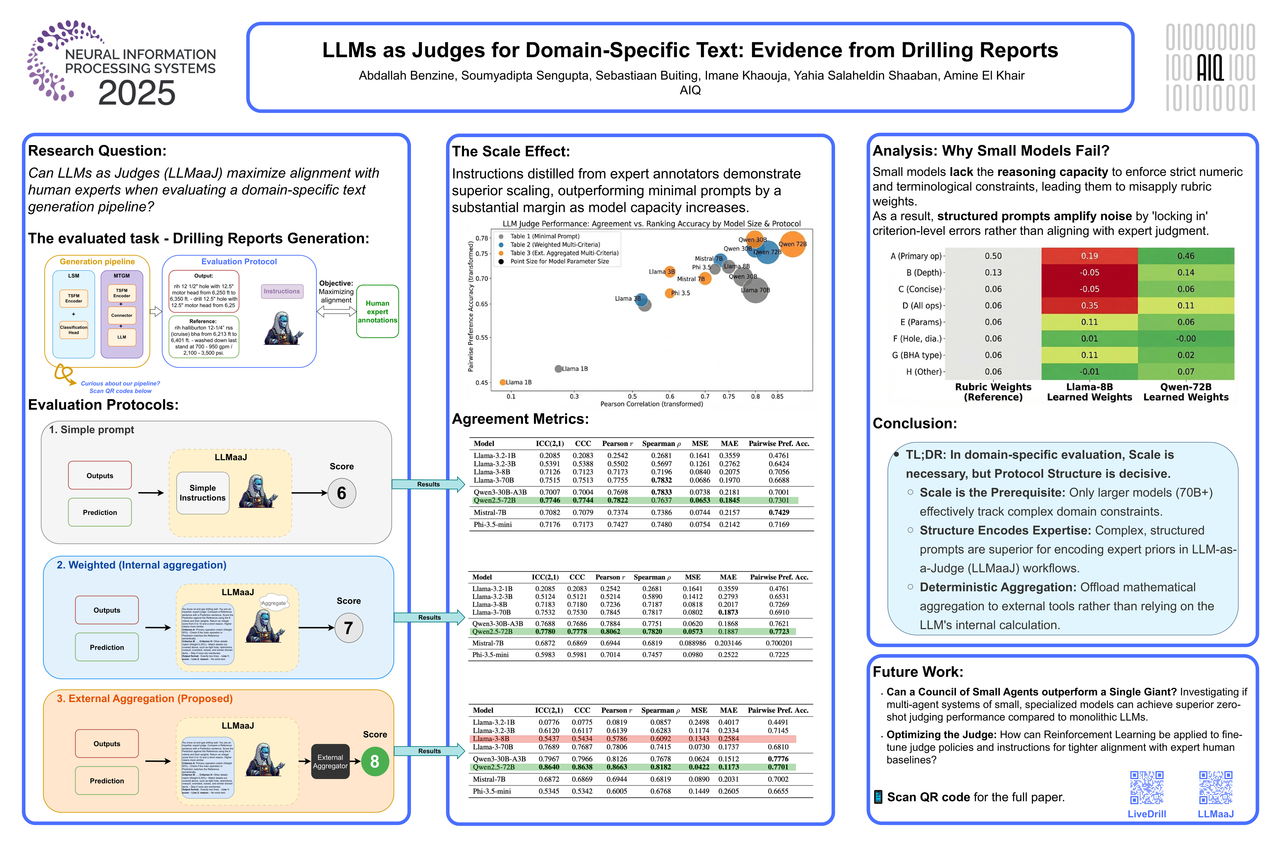 Large language models are now judged by other models in many workflows. This scales, but it is risky in domains where facts, numbers, and terminology matter. We study this in an industrial data-to-text setting: short, structured reports generated from time-series sensor data. The task is Daily Drilling Report (DDR) sentence generation, but the lessons apply to any domain-grounded pipeline.We evaluate LLMs used as judges under three protocols: a minimal single score, a weighted multi-criteria score, and a multi-criteria scheme with external aggregation. We compare model sizes and prompt designs using agreement metrics with human experts. Larger judges improve consistency, yet prompt and aggregation choices still cause large shifts in reliability and calibration. Smaller judges fail to track numeric and terminology constraints even with structure.The takeaways are practical. Good evaluation needs domain knowledge in the rubric, transparent aggregation, and stress tests that expose failure modes of LLM-as-judge. Our study offers a blueprint for building such evaluations in data-to-text applications and a caution against treating general-purpose judges as drop-in replacements for expert assessment.