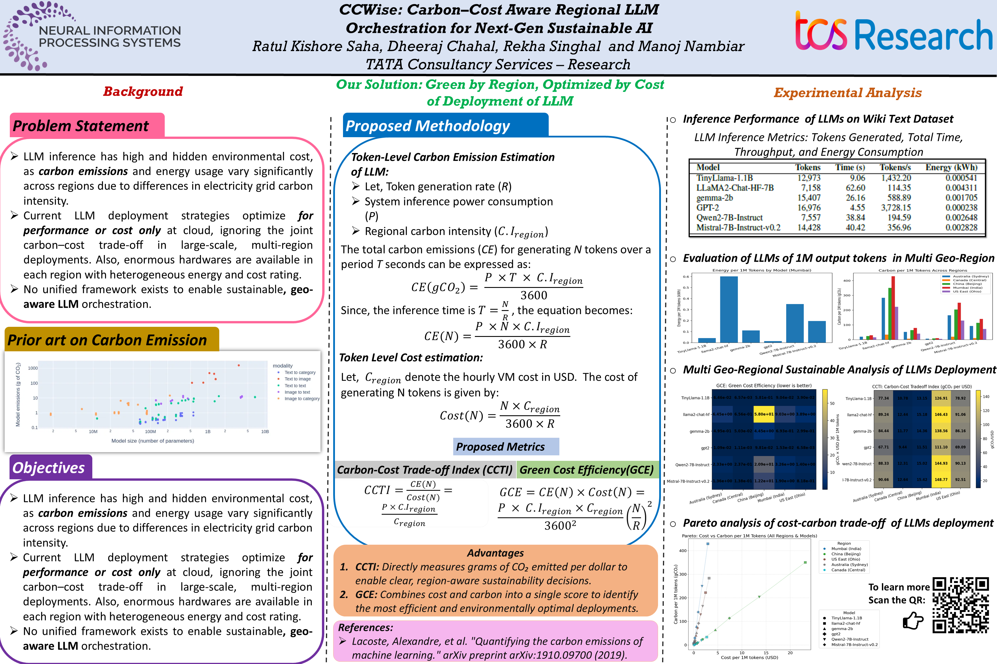 This paper presents a comprehensive orchestration for evaluating the sustainability of Large Language Models (LLMs) lifecycle by integrating carbon emissions, energy consumption, and cost-efficiency metrics across diverse geographic regions. We introduce two novel indices—Carbon-Cost Tradeoff Index (CCTI) and Green Cost Efficiency (GCE)—to quantify the environmental and economic trade-offs inherent in token generation of LLM deployment. Through extensive experimental analysis, including Pareto assessment of cost versus carbon footprint, we reveal the substantial impact of regional grid carbon intensity and model architecture on operational sustainability. Our findings highlight that smaller, region-optimized models consistently achieve superior carbon-cost performance, whereas deployments in carbon-intensive grids exhibit pronounced inefficiencies.