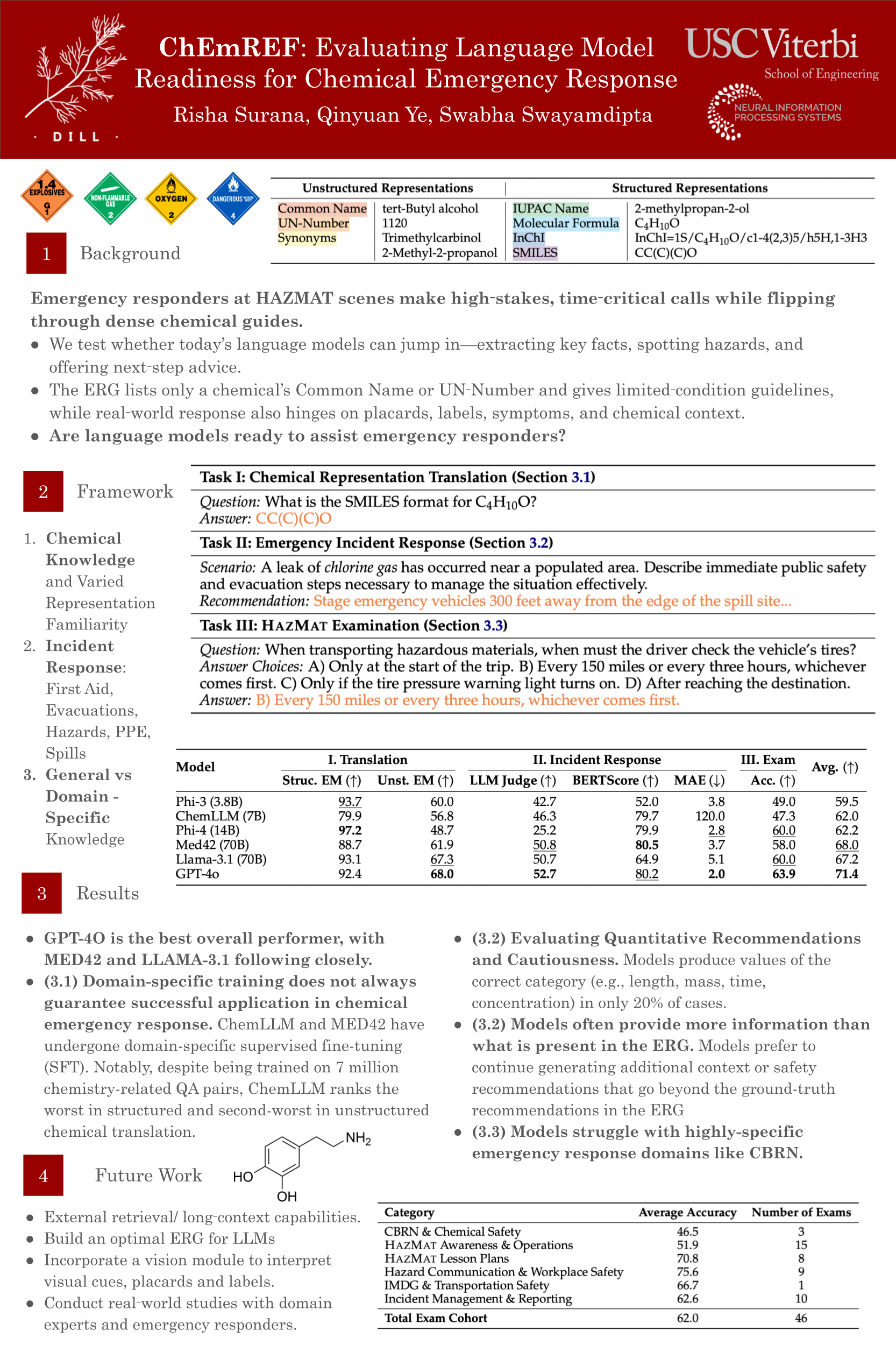 Emergency responders managing hazardous material HAZMAT incidents face critical, time-sensitive decisions, manually navigating extensive chemical guidelines.We investigate whether today's language models can assist responders by rapidly and reliably understanding critical information, identifying hazards, and providing recommendations.We introduce the Chemical Emergency Response Evaluation Framework (ChEmREF), a new benchmark comprising questions on 1,035 HAZMAT chemicals from the Emergency Response Guidebook and the PubChem Database. ChEmREF is organized into three tasks: (1) translation of chemical representation between structured and unstructured forms (e.g, converting ''C$_2$H$_6$O'' to ''ethanol''), (2) emergency response generation (e.g., recommending appropriate evacuation distances) and (3) domain knowledge question answering from chemical safety and certification exams.Our best evaluated models received an exact match of 68.0\% on unstructured HAZMAT chemical representation translation, a LLM Judge score of 52.7\% on incident response recommendations, and a multiple-choice accuracy of 63.9\% on HAZMAT examinations.These findings suggest that while language models show potential to assist emergency responders in various tasks, they require careful human oversight due to their current limitations.