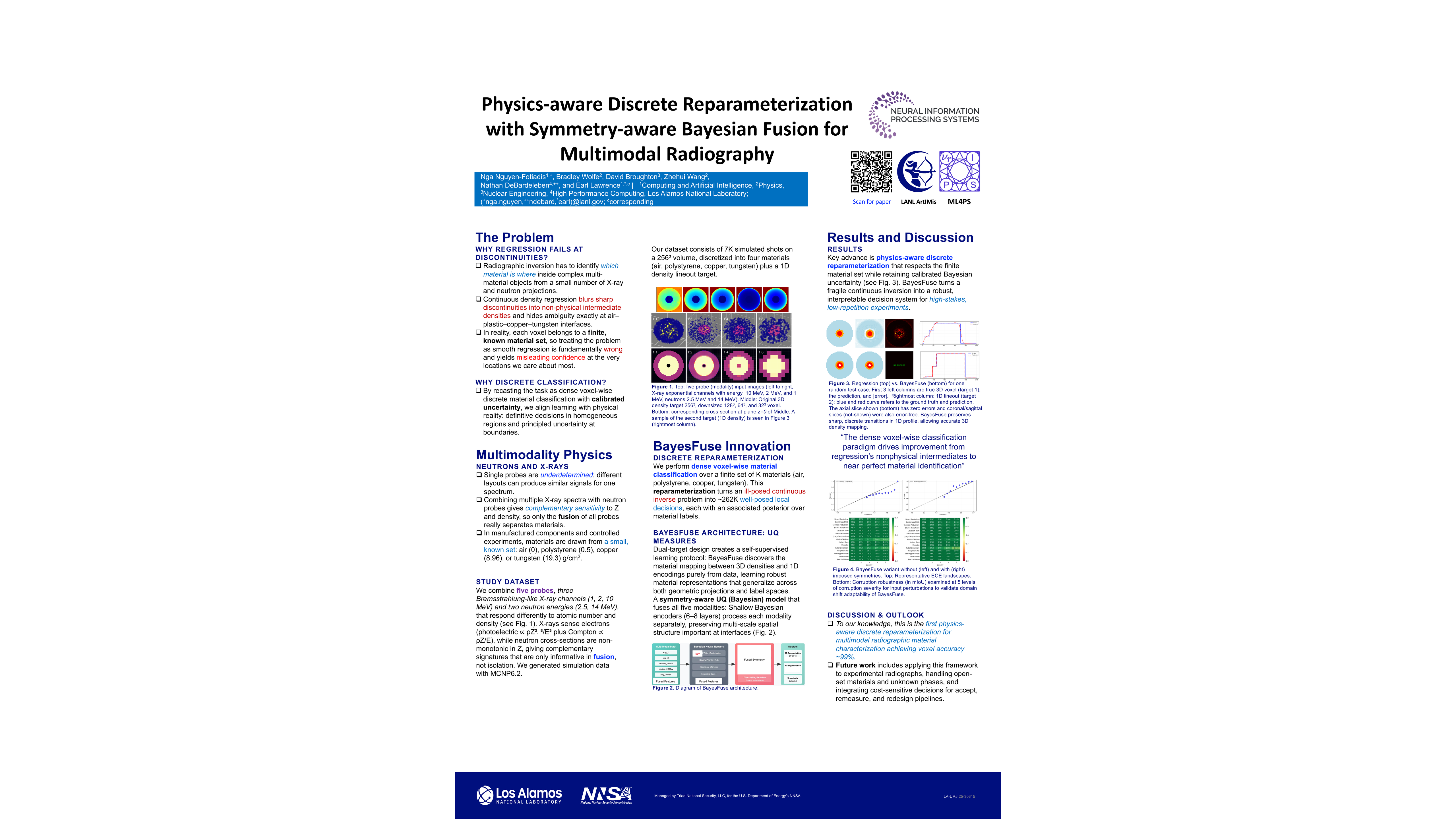 Radiographic inspection must identify materials from X-ray and neutron transmissions; single-probe signatures are often ambiguous, whereas multi-modal fingerprints are complementary because photons and neutrons have distinct interaction physics. Single-shot data contain discontinuities in density (voids, interfaces, inclusions). Modeling density as a smooth field (classical inversion or image-to-image regression) blurs those jumps and yields non-physical values. In practice, each voxel of the density field is drawn from a small, known material set; thus many inverse problems that appear continuous are in fact discrete, and standard regression fatally assumes continuity where none exists. We perform a physics-aware discrete reparameterization of the inverse problem: dense per-voxel discrete material classification with calibrated uncertainty, rather than continuous regression. We introduce BayesFuse, a symmetry-aware Bayesian model that fuses five probes (neutrons at 14 MeV and 2.5 MeV, plus three Bremsstrahlung-like X-ray spectra) and encodes in-plane rotational/view symmetries. On a multimodal dataset with 64^3 voxel volumes and 1D targets reparameterized to four materials (air, tungsten, copper, polystyrene; densities {0, 19.3, 8.96, 0.5} g/cm^3), BayesFuse attains near-perfect fidelity: mean Intersection over Union (mIoU) ~98–99% and Expected Calibration Error (ECE) ~3e-4 to 5e-4, with uncertainty concentrated at interfaces and rising gracefully under corruptions. The result is a well-posed, physics-aware decision system fit-for-purpose in high-stakes, low-replicate experiments.