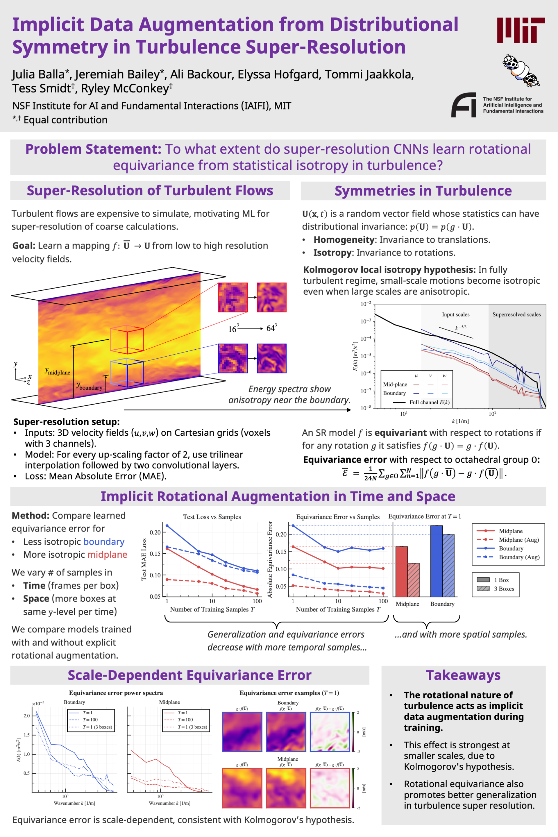 The immense computational cost of simulating turbulence has motivated the use of machine learning approaches for super-resolving turbulent flows. A central challenge is ensuring that learned models respect physical symmetries, such as rotational equivariance. We show that standard convolutional neural networks (CNNs) can partially acquire this symmetry without explicit augmentation or specialized architectures, as turbulence itself provides implicit rotational augmentation in both time and space. Using 3D channel-flow subdomains with differing anisotropy, we find that models trained on more isotropic mid-plane data achieve lower equivariance error than those trained on boundary layer data, and that greater temporal or spatial sampling further reduces this error. We show a distinct scale-dependence of equivariance error that occurs regardless of dataset anisotropy that is consistent with Kolmogorov’s local isotropy hypothesis. These results clarify when rotational symmetry must be explicitly incorporated into learning algorithms and when it can be obtained directly from turbulence, enabling more efficient and symmetry-aware super-resolution.