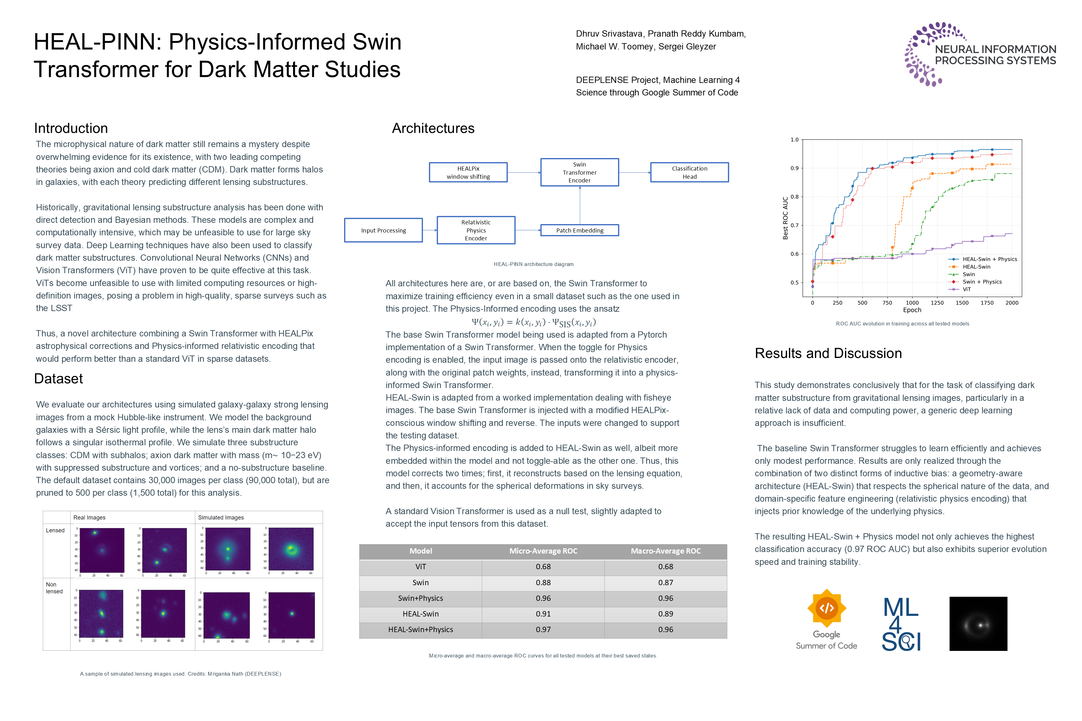 Strong gravitational lensing offers a powerful probe of the nature of dark matter from the morphology of its substructure. While expected to change in the next few years, current available data is sparse, making analyses of lensing systems for extraction of dark-matter properties difficult. In this work we propose a physics-informed Swin Transformer model, including a novel HEAL-Swin variant with the gravitational lensing equation embedded in the architecture, to classify between different models for dark matter from simulated lensing systems. We test the classification performance of various Swin Transformer models on a small dataset of these simulated lensing images, mimicking the current availability of lenses. The architectures include a base Swin Transformer model, a Swin Transformer model with the lensing equation baked into its architecture, a HEAL-Swin model, and HEAL-Swin with a physics-informed architecture. We then evaluate the models based on the evolution of Receiver Operating Characteristic Area Under the Curve (ROC AUC) and demonstrate that physics-informed HEAL-Swin evolves ROC AUC the fastest among all tested models.