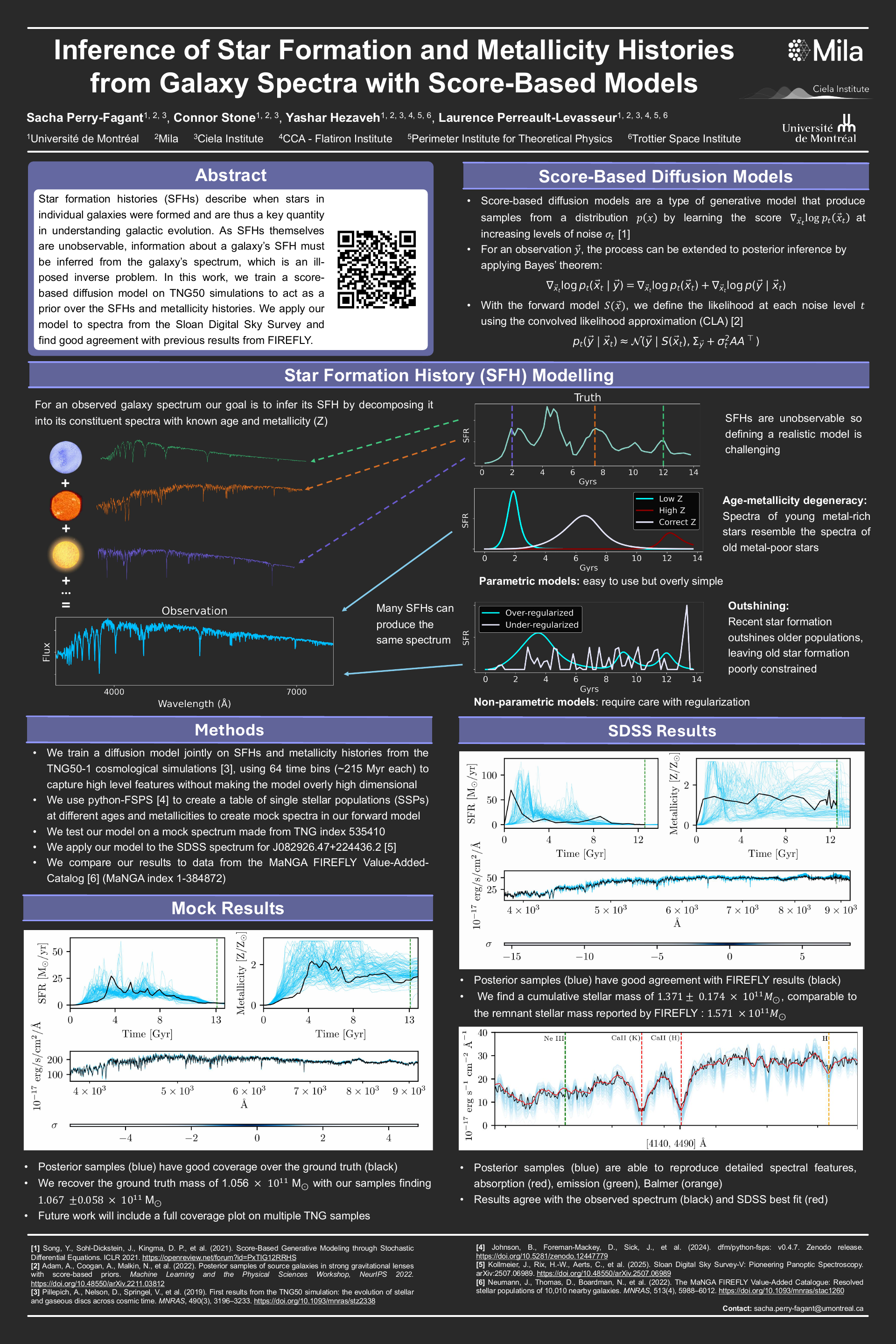 Star formation histories (SFHs) describe when stars in individual galaxies were formed, and are thus a key quantity in understanding galactic evolution. As SFHs themselves are unobservable, information about a galaxy’s SFH must be inferred from the galaxy’s spectrum, which is an ill-posed inverse problem. In this work, we train a score-based diffusion model to act as a prior over the SFHs. We collect our training data, SFHs and metallicity histories (MHs), from TNG50 simulations, ensuring that the samples include realistic features. We test our model by doing Bayesian posterior inference on mock observations. We apply our model to spectra from the Sloan Digital Sky Survey and find good agreement with previous results. Our work shows it is possible to infer detailed and realistic SFHs and MHs, opening a window to the study of galactic histories at a level of detail never before possible.