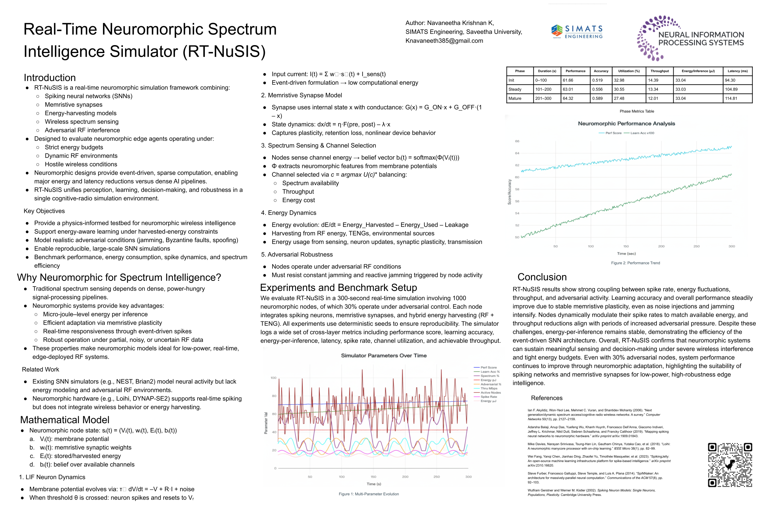 We present the Real-Time Neuromorphic Spectrum Intelligence Simulator (RTNuSIS), a modular framework to study spiking neural network (SNN) and memristor-inspired agents for dynamic spectrum access under constrained energy budgets and adversarial conditions. RT-NuSIS couples leaky integrate-and fire neuronal dynamics, memristive synaptic models, physics-informed energy harvesting models (triboelectric and RF), and adversary models including jamming and Byzantine behavior. We formalize the simulator mathematically, prove boundedness, present a mean-field adversary threshold, analyze per-step complexity, and provide a reproducible benchmark harness for energy-per-inference, latency, and robustness metrics. The codebase is modular, deterministic by seed, and designed for large-scale event-driven simulations.