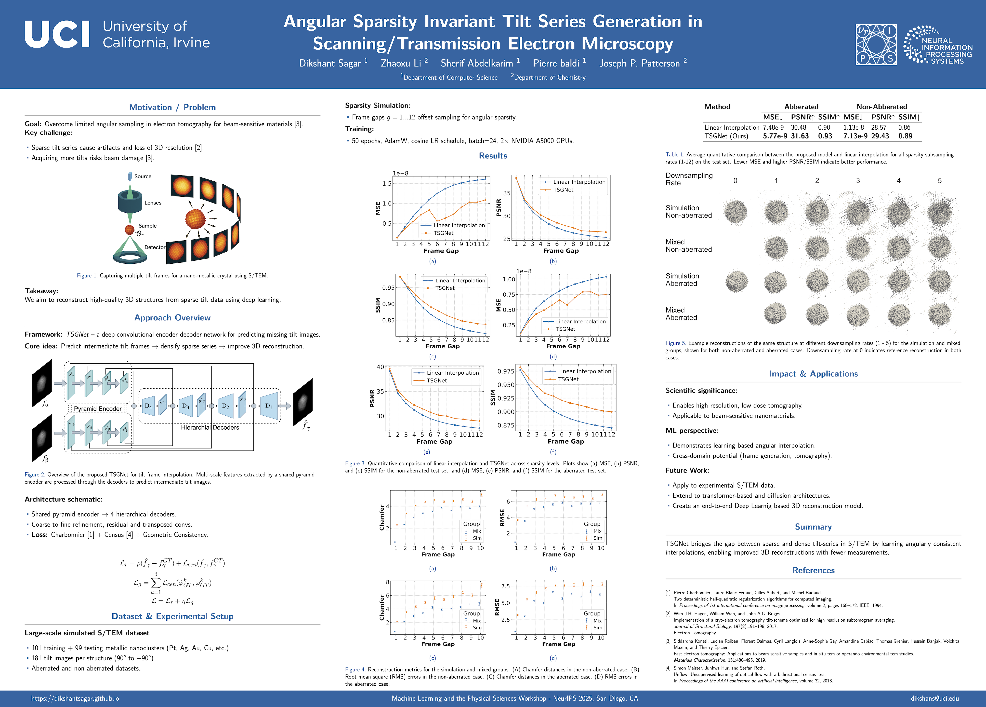 Scanning/Transmission electron microscopy (S/TEM) is a key technique for probing materials across atomic to micrometer scales. Advances in instrumentation now allow unprecedented spatial and temporal resolution, generating large datasets that are difficult to analyze manually. Automated methods are therefore essential, with deep convolutional neural networks (DCNNs) emerging as promising tools, though they require extensive training data and standardized evaluation. In this work, we introduce a large-scale simulated S/TEM dataset and propose an efficient encoder–decoder DCNN named TSGNet that predicts intermediate tilt frames to enhance sparse tilt series. Our approach improves 3D reconstruction resolution and scalability, achieving an average performance of 5.77e-9 MSE, 31.63 PSNR, and 0.93 SSIM on the held-out aberrated test set across multiple sparsity levels.