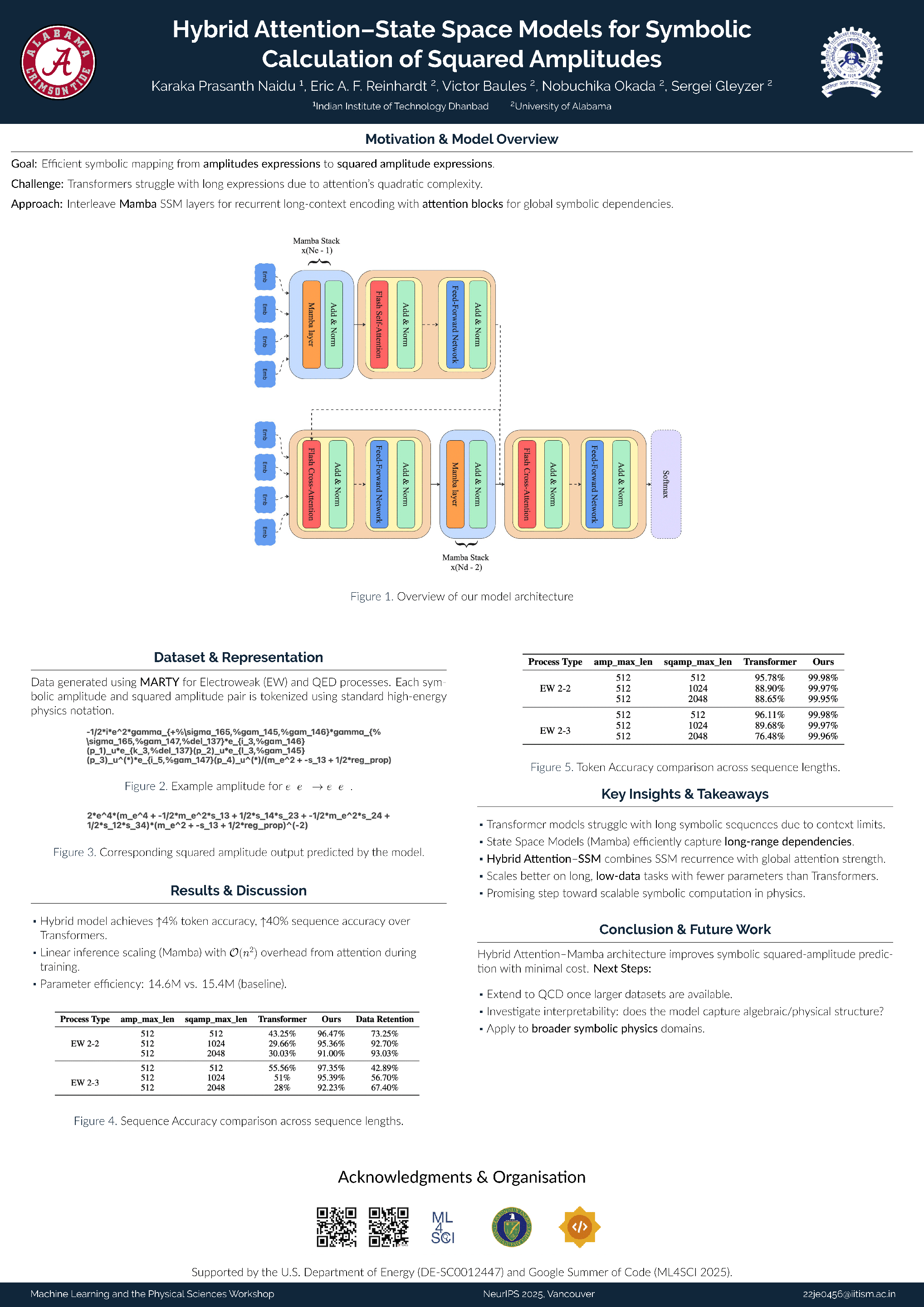 Calculating squared amplitudes is a key step in computing cross sections needed to compare experimental data with theoretical predictions. However, mapping amplitude expressions to their squared amplitude expressions is computationally expensive. Prior works have formulated this task as a sequence-to-sequence problem, demonstrating the effectiveness of Transformer-based encoder–decoder architectures. Despite these successes, such approaches have been limited to relatively short sequences and fail to scale effectively to longer inputs, primarily due to the limitations of attention mechanisms in handling extended context windows. State Space Models (SSMs), such as Mamba, offer a recurrent alternative that can achieve performance comparable to that of Transformers on some tasks. In this work, we investigate hybrid Attention and SSM architectures and show that they outperform Vanilla Transformers in a low-data, long-sequence task. The hybrid Attention-SSMs achieving up to a $\sim$4\% improvement in token accuracy and $\sim$40\% improvement in full sequence accuracy on the task of calculating squared amplitudes for electroweak physics processes.