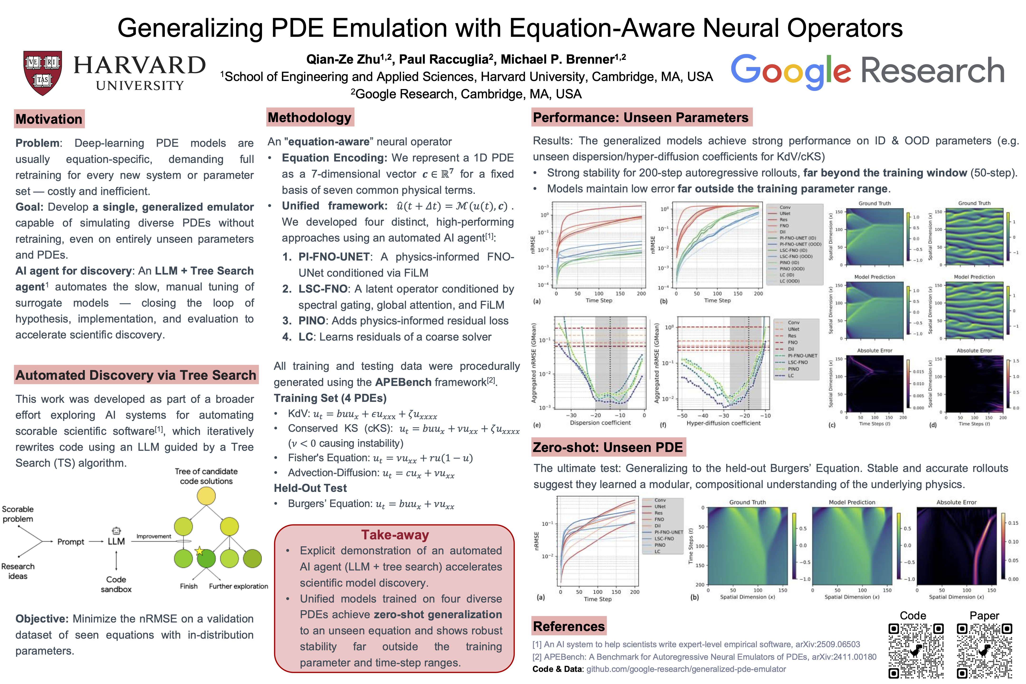 Solving partial differential equations (PDEs) can be prohibitively expensive using traditional numerical methods. Deep learning-based surrogate models (emulators) typically specialize in a single PDE with fixed parameters. We present a framework for equation-aware emulation that generalizes to unseen PDEs, conditioning a neural model on a vector encoding representing the PDE's terms and their coefficients. We learn a mapping that generalizes to unseen physical systems. We present a baseline of four distinct modeling technqiues, trained on a family of 1D PDEs from the APEBench suite. Our approach achieves strong performance on parameter sets held out from the training distribution, with strong stability for rollout beyond the training timesteps, and generalization to an entirely unseen PDE.