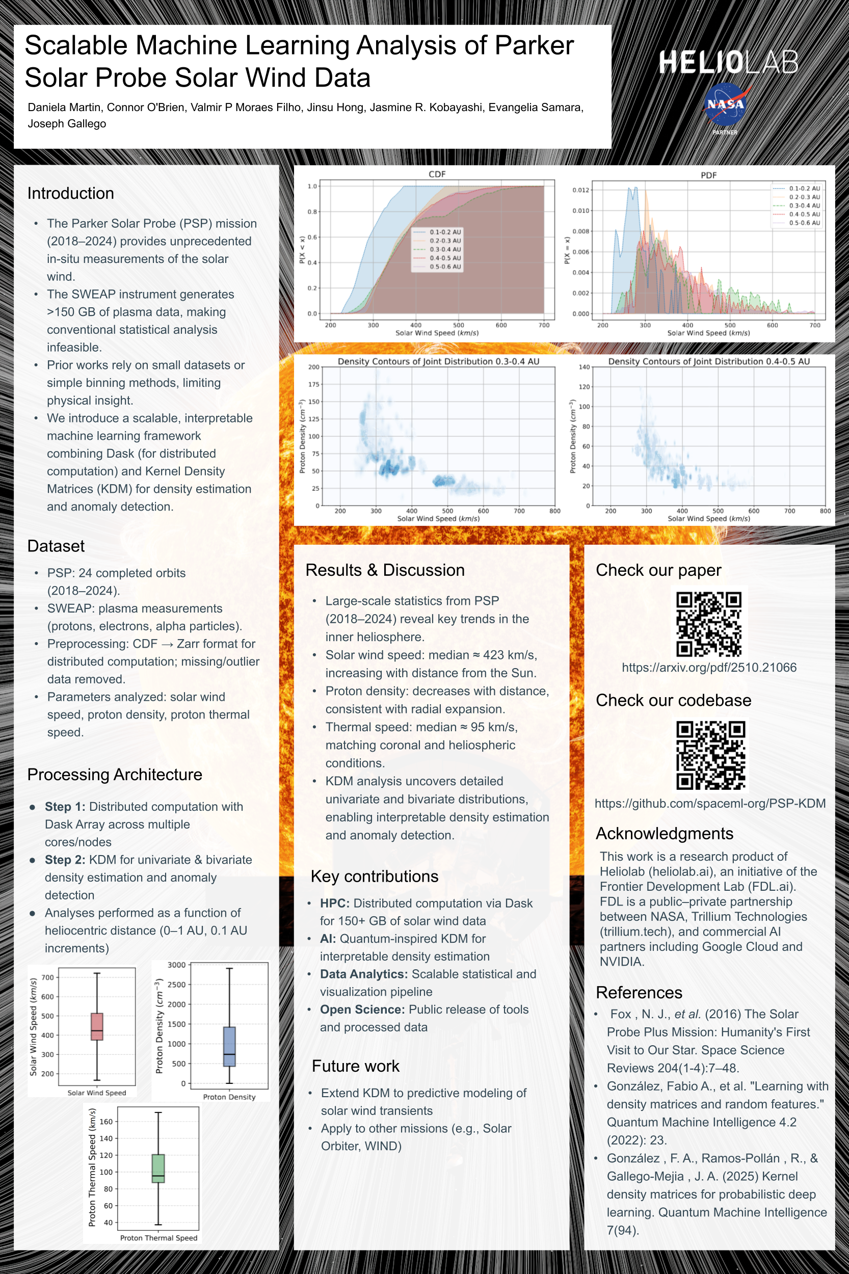 We present a scalable machine learning framework for analyzing Parker Solar Probe (PSP) solar wind data using distributed processing and the quantum-inspired Kernel Density Matrices (KDM) method. The PSP dataset (2018--2024) exceeds 150 GB, challenging conventional analysis approaches. Our framework leverages Dask for large-scale statistical computations and KDM to estimate univariate and bivariate distributions of key solar wind parameters, including solar wind speed, proton density, and proton thermal speed, as well as anomaly thresholds for each parameter. We reveal characteristic trends in the inner heliosphere, including increasing solar wind speed with distance from the Sun, decreasing proton density, and the inverse relationship between speed and density. Solar wind structures play a critical role in enhancing and mediating extreme space weather phenomena and can trigger geomagnetic storms; our analyses provide quantitative insights into these processes. This approach offers a tractable, interpretable, and distributed methodology for exploring complex physical datasets and facilitates reproducible analysis of large-scale in situ measurements. Processed data products and analysis tools are made publicly available to advance future studies of solar wind dynamics and space weather forecasting.