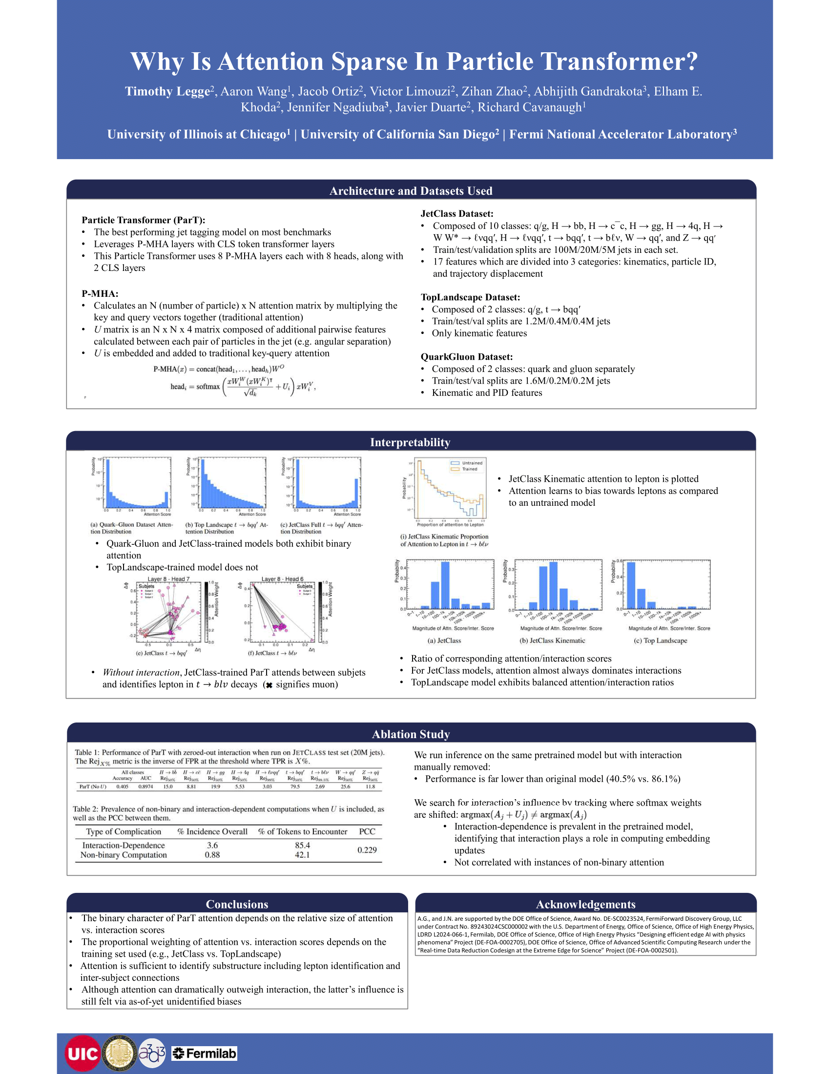 Transformer-based models have achieved state-of-the-art performance in jet tagging at the CERN Large Hadron Collider (LHC), with the Particle Transformer (ParT) representing a leading example of such models. A striking feature of ParT is its sparse, nearly binary attention structure, raising questions about the origin of this behavior and whether it encodes physically meaningful correlations. In this work, we investigate the source of ParT’s sparse attention by comparing models trained on multiple benchmark datasets and examine the relative contributions of the attention term and the physics-inspired interaction matrix before softmax. We find that binary sparsity arises primarily from the attention mechanism itself, with the interaction matrix playing a secondary role. Moreover, we show that ParT is able to identify key jet substructure features, such as leptons in semileptonic top decays, even without explicit particle identification inputs. These results provide new insight into the interpretability of transformer-based jet taggers and clarify the conditions under which sparse attention patterns emerge in ParT.