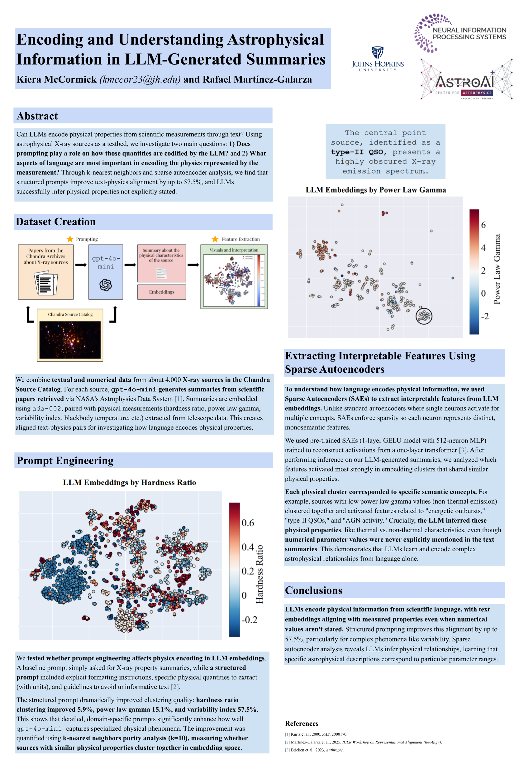 Large Language Models have demonstrated the ability to generalize well at many levels across domains, modalities, and even shown in-context learning capabilities. This enables research questions regarding how they can be used to encode physical information that is usually only available from scientific measurements, and loosely encoded in textual descriptions. Using astrophysics as a test bed, we investigate if LLM embeddings can codify physical summary statistics that are obtained from scientific measurements through two main questions: 1) Does prompting play a role on how those quantities are codified by the LLM? and 2) What aspects of language are most important in encoding the physics represented by the measurement? We investigate this using sparse autoencoders that extract interpretable features from the text.