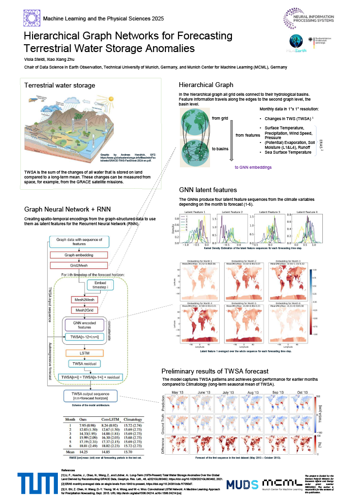 The availability of fresh water is vital to the ecosystem and communities. In a changing climate, the increased risk of droughts makes it more important to have an accurate view of changes in terrestrial water storage (TWS). Predicting changes in TWS is inherently difficult since it integrates the changes of all water compartments, with underlying processes that operate on vastly different temporal and spatial scales. In our work, we explore a novel design of a hierarchical graph using domain knowledge of hydrological basins to encode these processes in a latent feature sequence using an encoder-processor-decoder style graph neural network. The subsequent recurrent neural network then forecasts changes in TWS from the latent feature sequence and historical TWS evolution for up to six months ahead. The gridded product of the seasonal forecast of global TWS evolution shows improvement over a seasonal long-term mean.