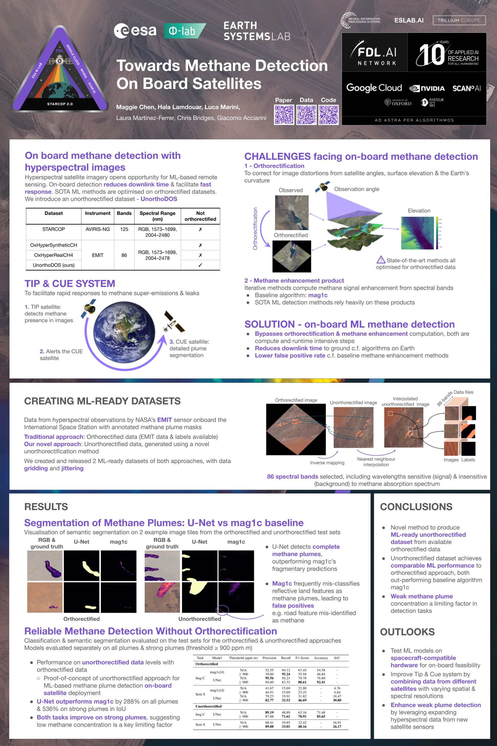 Methane is a potent greenhouse gas and a major driver of climate change, making its timely detection critical for effective mitigation. Machine learning (ML) deployed onboard satellites can enable rapid detection while reducing downlink costs, supporting faster response systems. Conventional methane detection methods often rely on image processing techniques, such as \textit{orthorectification} to correct geometric distortions and \textit{matched filters} to enhance plume signals.We introduce a novel approach that bypasses these preprocessing steps by using \textit{unorthorectified} data (UnorthoDOS). We find that ML models trained on this dataset achieve performance comparable to those trained on orthorectified data. Moreover, we also train models on an orthorectified dataset, showing that they can outperform the matched filter baseline (mag1c).We release model checkpoints and two ML-ready datasets comprising orthorectified and unorthorectified hyperspectral images from the Earth Surface Mineral Dust Source Investigation (EMIT) sensor at \url{https://huggingface.co/datasets/SpaceML/UnorthoDOS}, along with code at \url{https://github.com/spaceml-org/plume-hunter}.