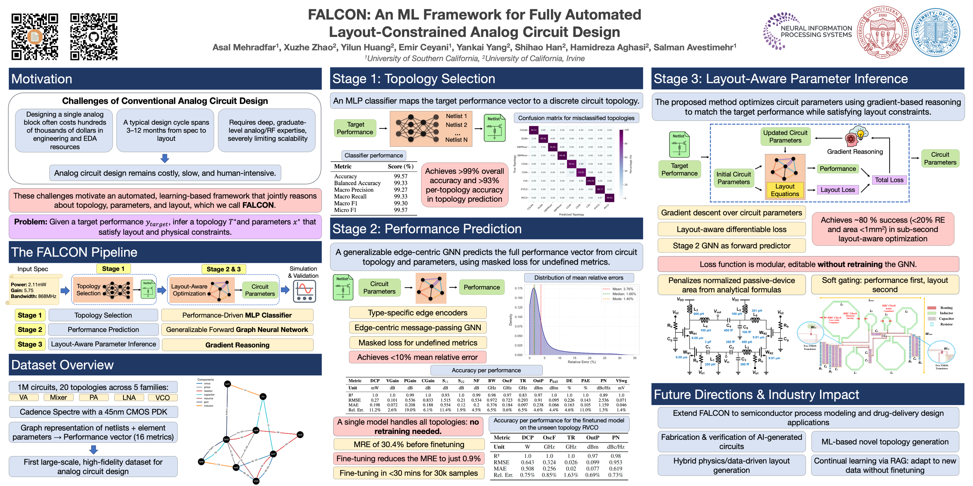 Designing analog circuits from performance specifications is a complex, multi-stage process encompassing topology selection, parameter inference, and layout feasibility. We introduce FALCON, a unified machine learning framework that enables fully automated, specification-driven analog circuit synthesis through topology selection and layout-constrained optimization. Given a target performance, FALCON first selects an appropriate circuit topology using a performance-driven classifier guided by human design heuristics. Next, it employs a custom, edge-centric graph neural network trained to map circuit topology and parameters to performance, enabling gradient-based parameter inference through the learned forward model. This inference is guided by a differentiable layout cost, derived from analytical equations capturing parasitic and frequency-dependent effects, and constrained by design rules. We train and evaluate FALCON on a large-scale custom dataset of 1M analog mm-wave circuits, generated and simulated using Cadence Spectre across 20 expert-designed topologies. Through this evaluation, FALCON demonstrates >99% accuracy in topology inference, <10% relative error in performance prediction, and efficient layout-aware design that completes in under 1 second per instance. Together, these results position FALCON as a practical and extensible foundation model for end-to-end analog circuit design automation.