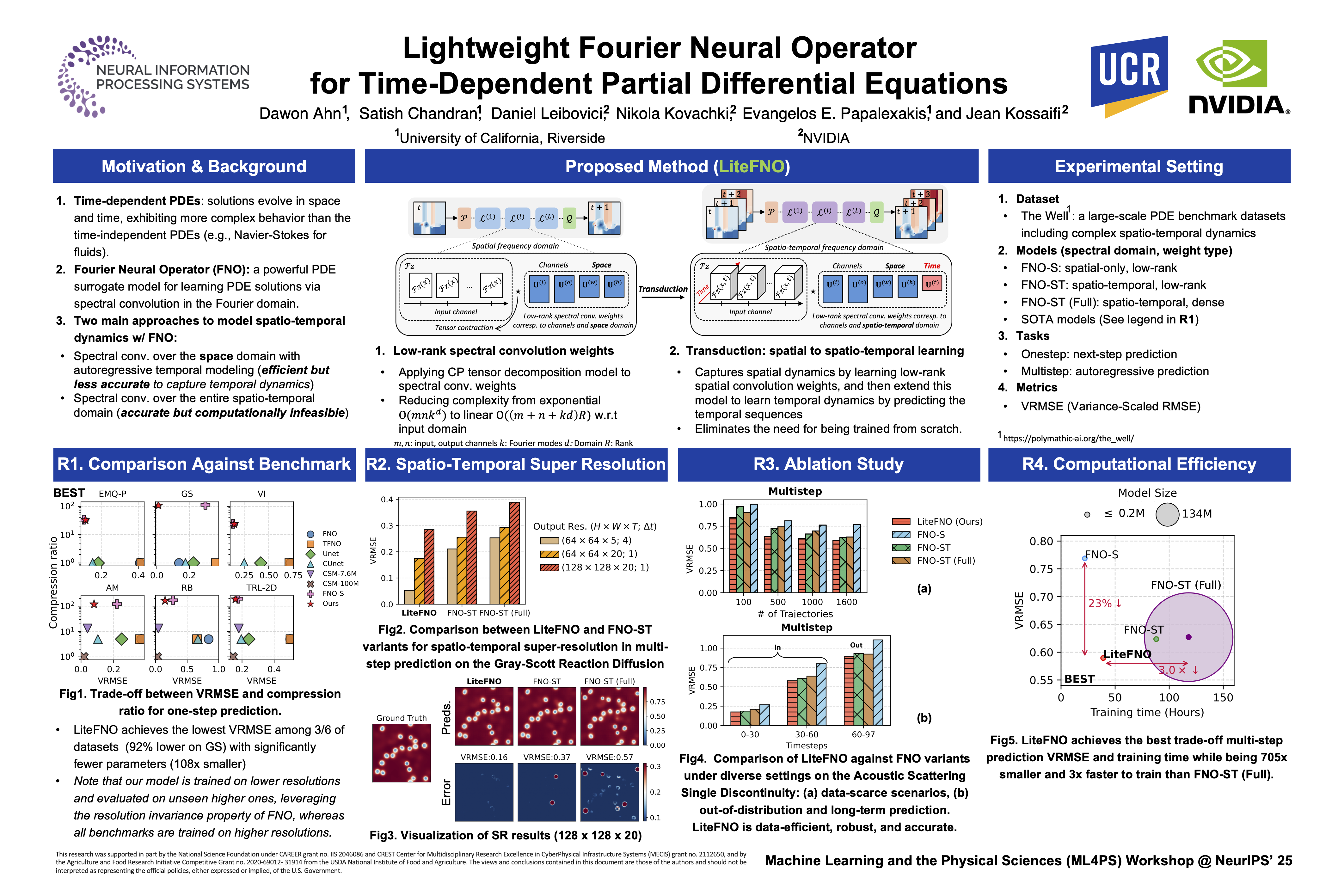 Fourier Neural Operators (FNOs) have shown strong performance in solving time-dependent partial differential equations (PDEs). However, accurately modeling complex spatio-temporal dynamics remains challenging and is typically addressed in one of two ways: (i) by applying spectral convolutions over the spatial domain with temporal dynamics handled autoregressively, or (ii) by applying spectral convolutions over the entire spatio-temporal domain. While the former is more computationally efficient, it fails to capture true spatio-temporal interactions. The latter, though more accurate, becomes computationally prohibitive when scaling to larger datasets.We propose \method, a novel FNO framework that achieves both numerical accuracy and computational efficiency for time-dependent PDEs. Specifically, we first model spatial dynamics by learning a low-rank spatial basis of spectral convolutional weights space. We then incorporate temporal dynamics by learning a new temporal basis through transduction. This factorized formulation enables efficient learning of full spatio-temporal dynamics with significantly fewer parameters (99.9% reduction) and superior performance (44% improvement in VRMSE) compared to the variants of FNO models. The source code and the dataset are available at https://anonymous.4open.science/r/LFNO.