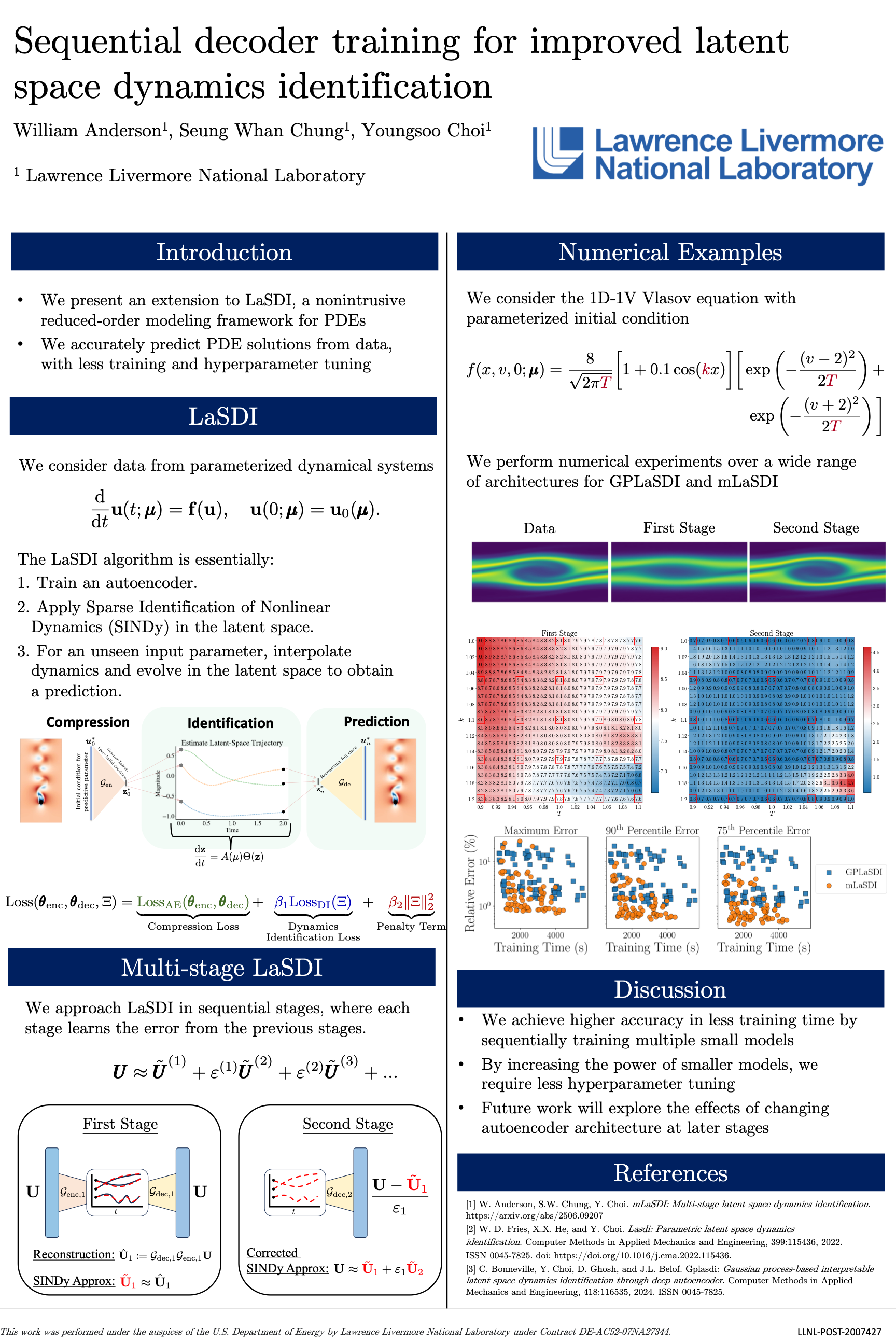 Accurate numerical solutions of partial differential equations are essential in many scientific fields but often require computationally expensive solvers, motivating reduced-order models (ROMs). Latent Space Dynamics Identification (LaSDI) is a data-driven ROM framework that combines autoencoders with equation discovery to learn interpretable latent dynamics. However, enforcing latent dynamics during training can compromise reconstruction accuracy of the model for simulation data. We introduce multi-stage LaSDI (mLaSDI), a framework that improves reconstruction and prediction accuracy by sequentially learning additional decoders to correct residual errors from previous stages. Applied to the 1D-1V Vlasov equation, mLaSDI consistently outperforms standard LaSDI, achieving lower prediction errors and reduced training time across a wide range of architectures.