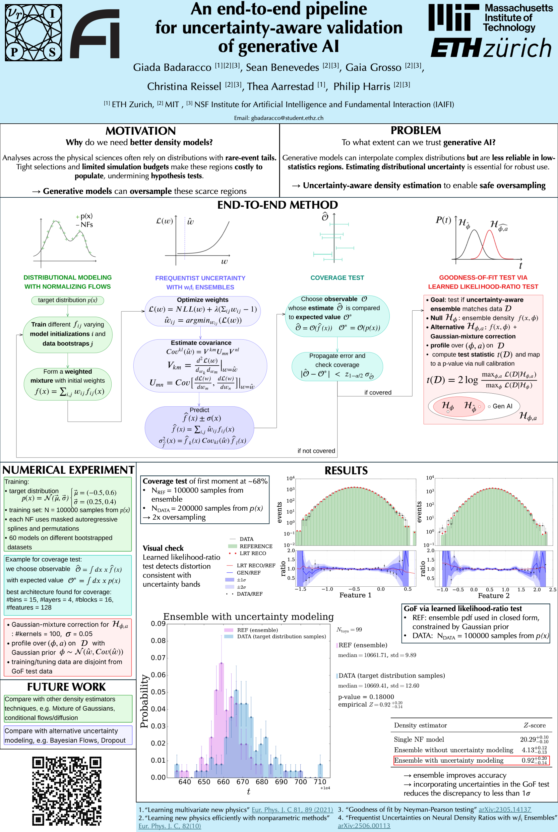 Density estimation with generative AI is a common task in the physical sciences, with applications ranging from particle physics to gravitational-wave parameter estimation.Many of the existing methods, however, do not provide a way to estimate epistemic uncertainties, which is essential for reliable hypothesis testing necessary for scientific discovery. We propose an end-to-end framework combining generative modeling with principled uncertainty quantification. A normalizing-flow ensemble is trained to synthesize events; ensemble-based epistemic uncertainties are computed and propagated into a learned likelihood–ratio goodness-of-fit (GoF) test. This yields to robust distributional estimates that allow for oversampling and enables uncertainty-aware scientific discoveries.