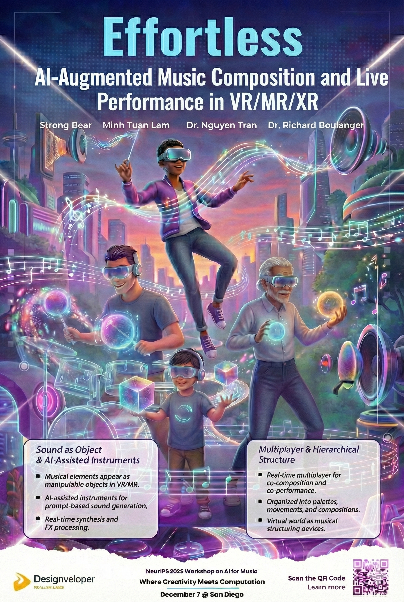 We present an immersive multiplayer system for the Meta Quest platform that enables new modes of music composition and performance through the integration of virtual reality (VR), mixed reality (MR), and artificial intelligence (AI). Built in Unity, the system allows multiple players to interact in shared VR worlds or real physical environments via passthrough. Musical elements are represented as tangible objects within these environments, making sound directly manipulable. AI-assisted instruments extend creative possibilities by enabling prompt-based sound generation, real-time audio synthesis, and automatic transformation of existing MIDI clips into new material. Musical elements are hierarchically structured: sounds can be grouped into palettes, combined into movements, and ultimately assembled into full compositions. This system introduces a novel paradigm for collaborative, embodied, and AI-augmented music creation.