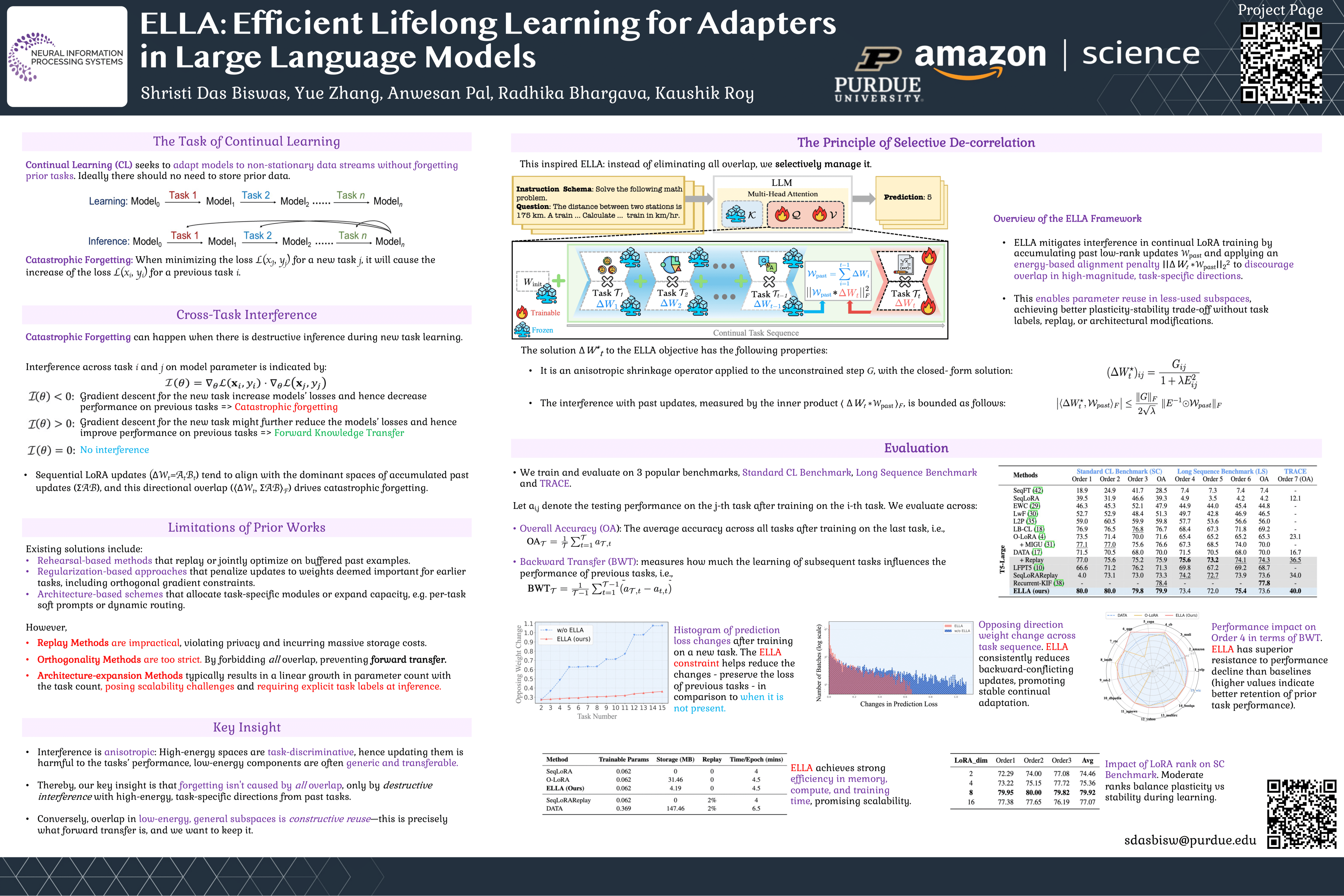 Continual Learning (CL) is a vital requirement for deploying large language models (LLMs) in today's dynamic world. Existing approaches seek to acquire task-specific knowledge via parameter-efficient fine-tuning (PEFT) with reduced compute overhead. However, sequential FT often sacrifices performance retention and forward transfer, especially under replay-free constraints. We introduce ELLA, a novel CL framework that regularizes low-rank adapter updates via cross-task subspace decorrelation. By learning a compact adapter per task and penalizing overlap between representational subspaces for past and current adapter activations, ELLA encourages task specialization while preserving prior knowledge, without storing data. Across $3$ benchmarks, ELLA outperforms prior CL methods in both accuracy and forgetting metrics, providing a scalable solution for lifelong LLM learning.