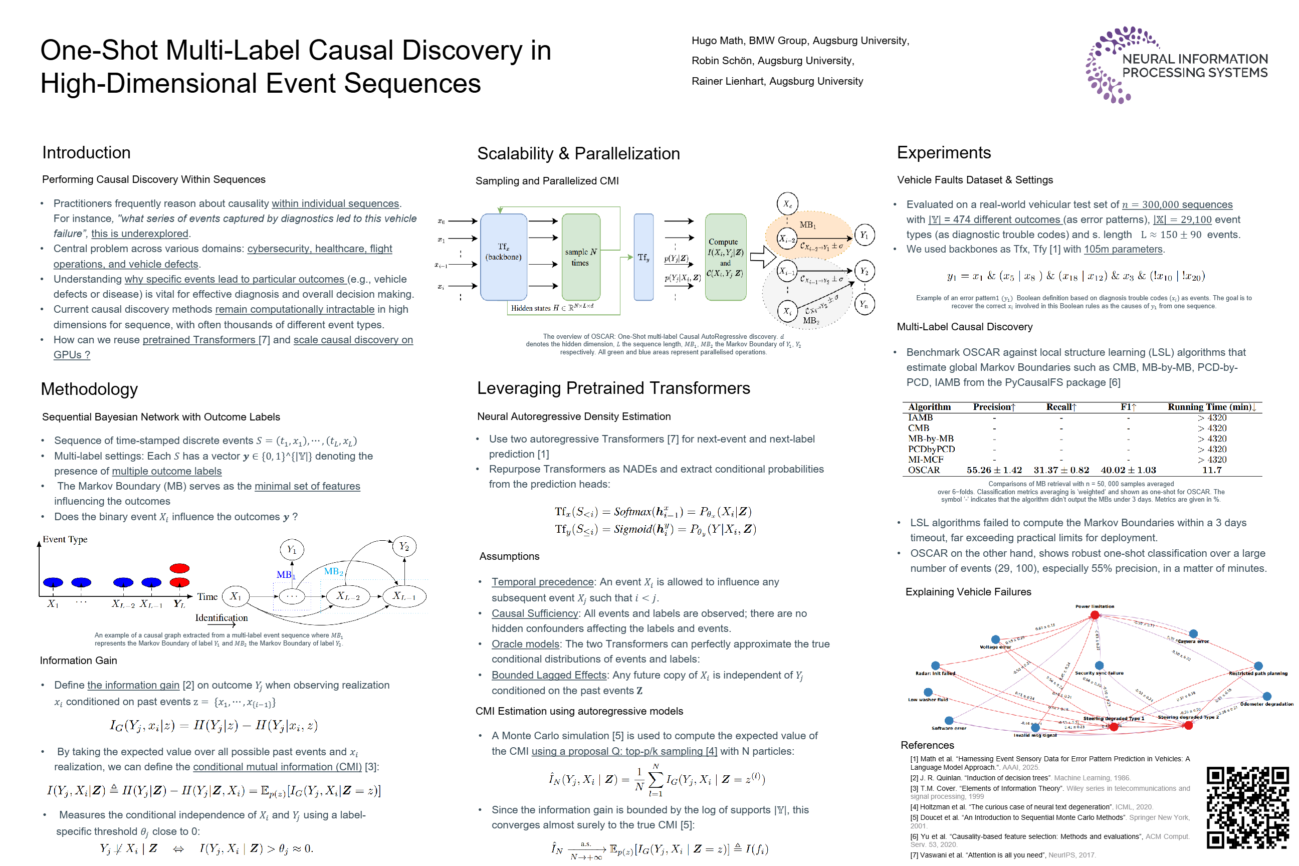 Understanding causality in event sequences with thousands of sparse event types is critical in domains such as healthcare, cybersecurity or vehicle diagnostics, yet current methods fail to scale. We present OSCAR, a one-shot causal autoregressive method that infers per-sequence Markov Boundaries using two pretrained Transformers as density estimators. This enables efficient, parallel causal discovery without costly global CI testing. On a real-world automotive dataset with 29,100 events and 474 labels, OSCAR recovers interpretable causal structures in minutes, while classical methods fail to scale— enabling practical scientific diagnostics at production scale.