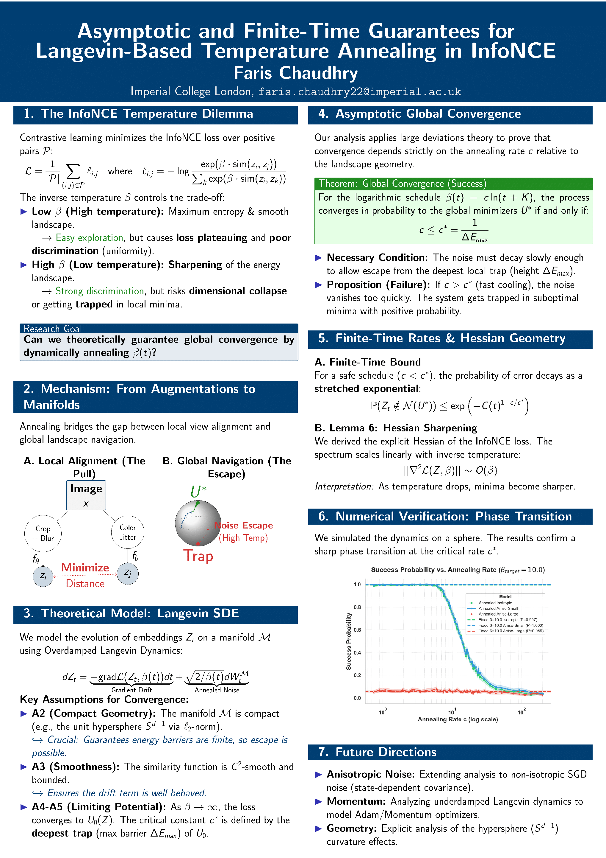 The InfoNCE loss in contrastive learning depends critically on a temperature parameter, yet its dynamics under fixed versus annealed schedules remain poorly understood. We provide a theoretical analysis by modeling embedding evolution under Langevin dynamics on a compact Riemannian manifold. Under mild smoothness and energy-barrier assumptions, we show that classical simulated annealing guarantees extend to this setting: slow logarithmic inverse-temperature schedules ensure convergence in probability to a globally optimal representation, while faster schedules risk trapping in suboptimal minima. Our results establish a formal link between contrastive learning and simulated annealing, providing a principled basis for understanding and tuning temperature schedules.