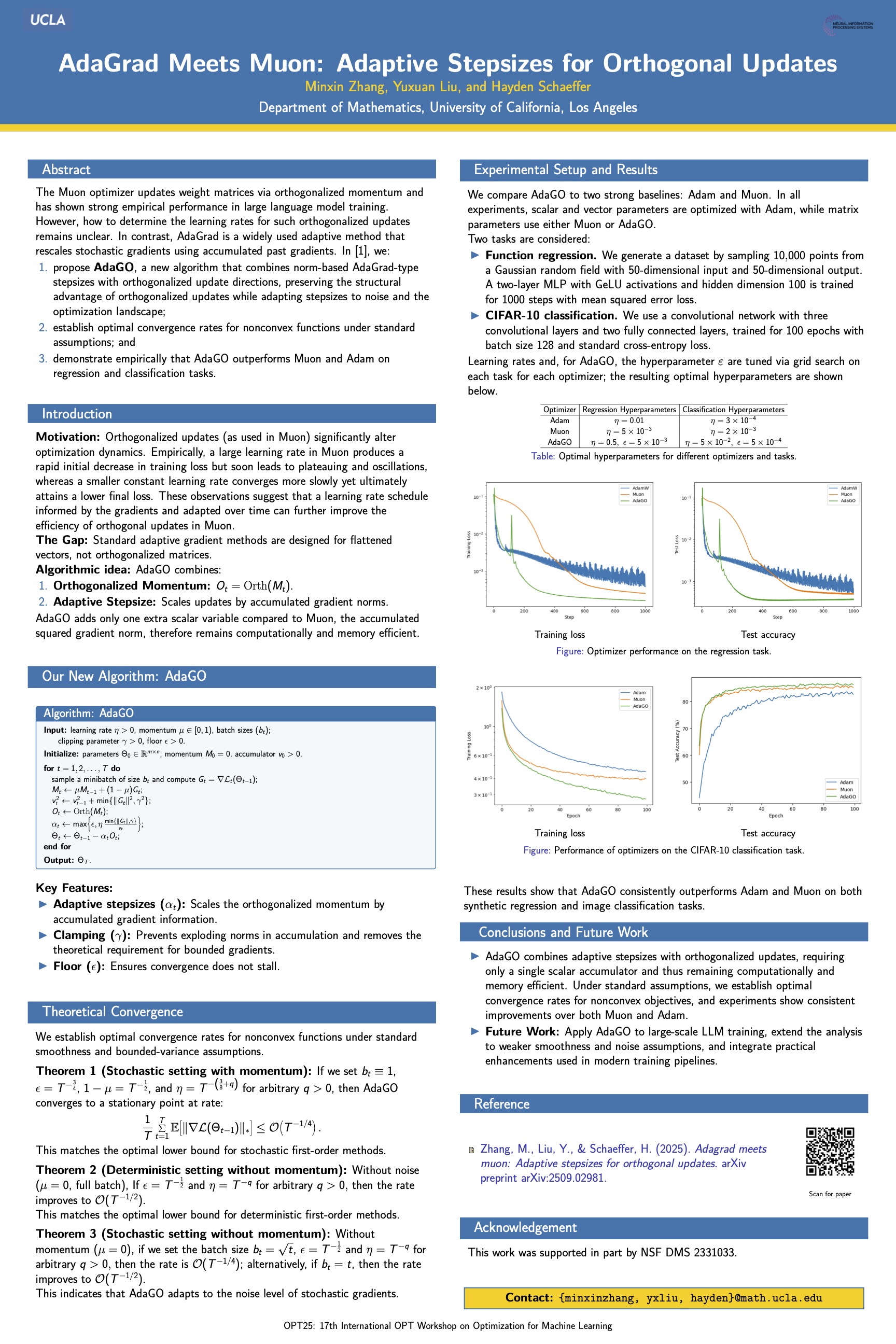 The recently proposed optimizer Muon updates weight matrices via orthogonalized momentum and has demonstrated strong empirical success in large language model training. However, it remains unclear how to determine the learning rates for such orthogonalized updates. AdaGrad, by contrast, is a widely used adaptive method that scales stochastic gradients by accumulated past gradients. We propose a new algorithm, AdaGO, which combines a norm-based AdaGrad-type stepsize with an orthogonalized update direction, bringing together the benefits of both approaches. Unlike other adaptive variants of Muon, AdaGO preserves the orthogonality of the update direction, which can be interpreted as a spectral descent direction, while adapting the stepsizes to the optimization landscape by scaling the direction with accumulated past gradient norms. The implementation of AdaGO requires only minimal modification to Muon, with a single additional scalar variable, the accumulated squared gradient norms, to be computed, making it computationally and memory efficient. Optimal theoretical convergence rates are established for nonconvex functions in both stochastic and deterministic settings under standard smoothness and unbiased bounded-variance noise assumptions. Empirical results on CIFAR-10 classification and function regression demonstrate that AdaGO outperforms Muon and Adam.