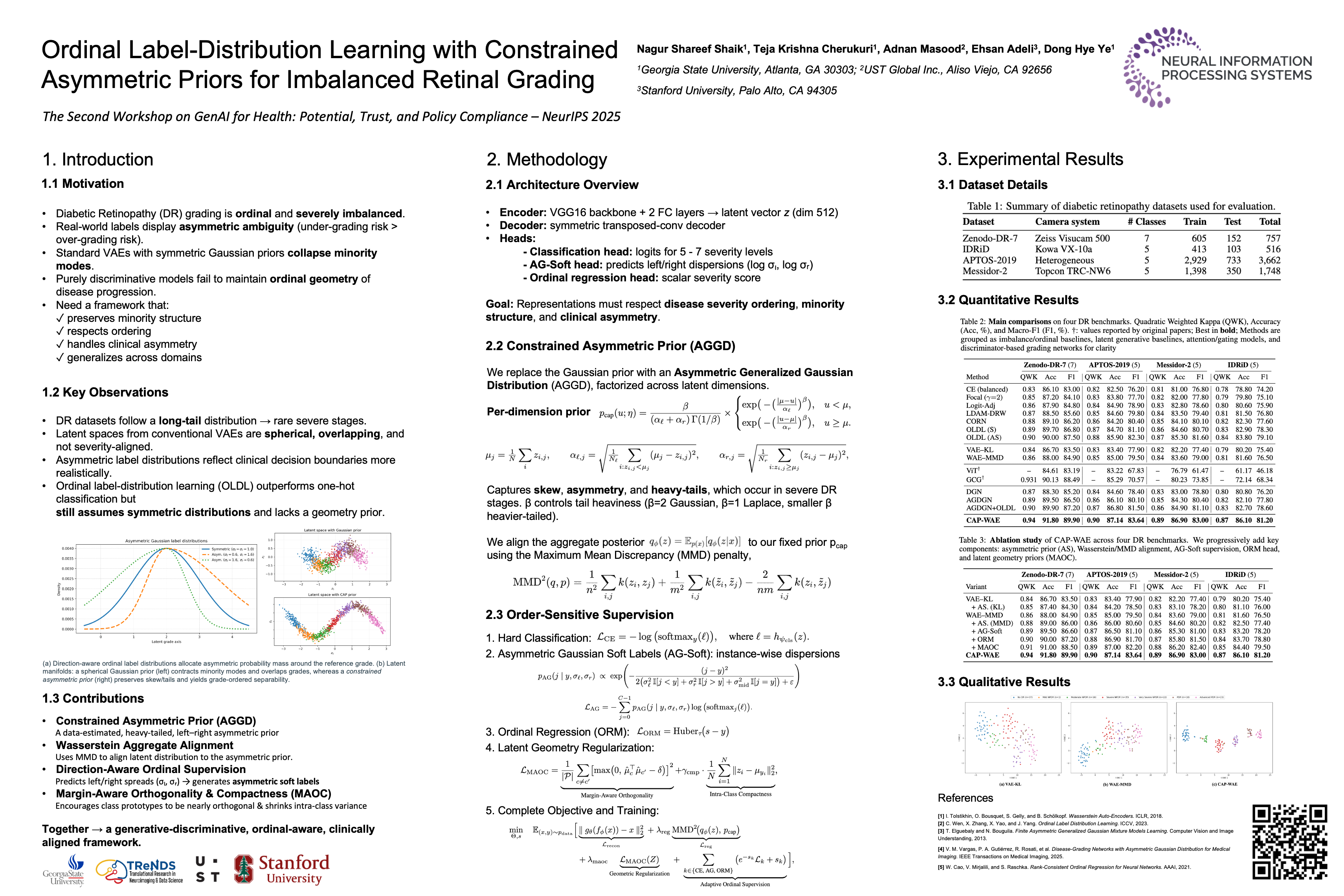 Diabetic retinopathy grading is inherently ordinal and long-tailed, with minority stages being scarce, heterogeneous, and clinically critical to detect accurately. Conventional methods often rely on isotropic Gaussian priors and symmetric loss functions, misaligning latent representations with the task’s asymmetric nature. We propose the Constrained Asymmetric Prior Wasserstein Autoencoder (CAP-WAE), a novel framework that addresses these challenges through three key innovations. Our approach employs a Wasserstein Autoencoder (WAE) that aligns its aggregate posterior with a \emph{asymmetric prior}, preserving the heavy-tailed and skewed structure of minority classes. The latent space is further structured by a \emph{Margin-Aware Orthogonality and Compactness (MAOC)} loss to ensure grade-ordered separability. At the supervision level, we introduce a direction-aware ordinal loss, where a lightweight head predicts asymmetric dispersions to generate soft labels that reflect clinical priorities by penalizing under-grading more severely. Stabilized by an adaptive multi-task weighting scheme, our end-to-end model requires minimal tuning. Across public DR benchmarks, CAP–WAE consistently achieves state-of-the-art Quadratic Weighted Kappa, accuracy, and macro-F1, surpassing both ordinal classification and latent generative baselines. t-SNE visualizations further reveal that our method reshapes the latent manifold into compact, grade-ordered clusters with reduced overlap.