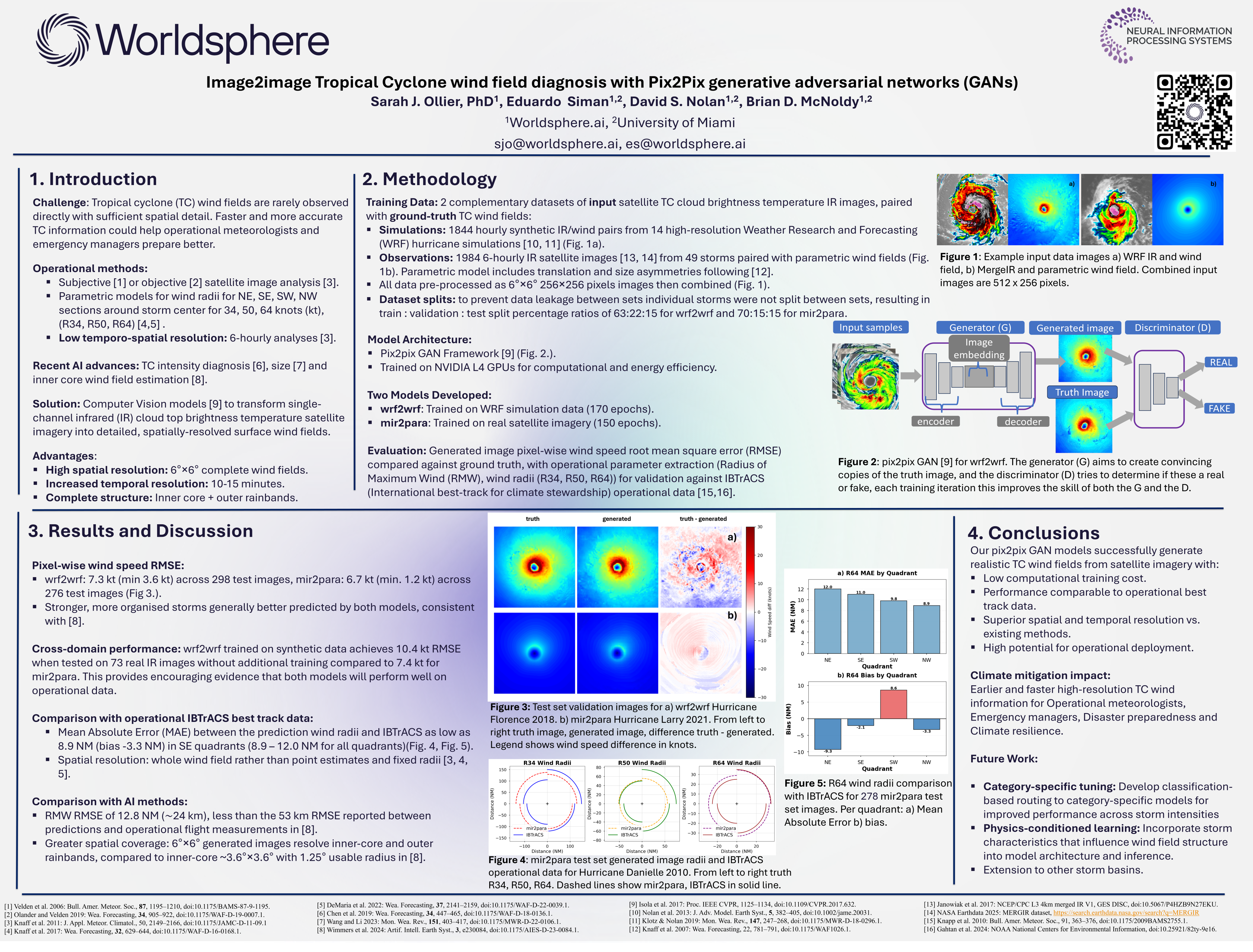 Recent AI advances enable tropical cyclone (TC) diagnosis from satellite imagery, extracting wind intensity and storm size for operational analyses and forecasts. While complete and sufficiently detailed horizontal wind fields are rarely observed directly, this study presents pix2pix generative adversarial networks (GANs) that predict surface wind fields from real and simulated infrared brightness temperatures using thousands of realistic TC image pairs. Applied to modified real infrared images, the algorithm produces realistic wind fields comparable to observations. Insights from this project will inform future development for live satellite imagery diagnosis to enable higher resolution TC wind information earlier and faster for meteorologists and emergency managers.