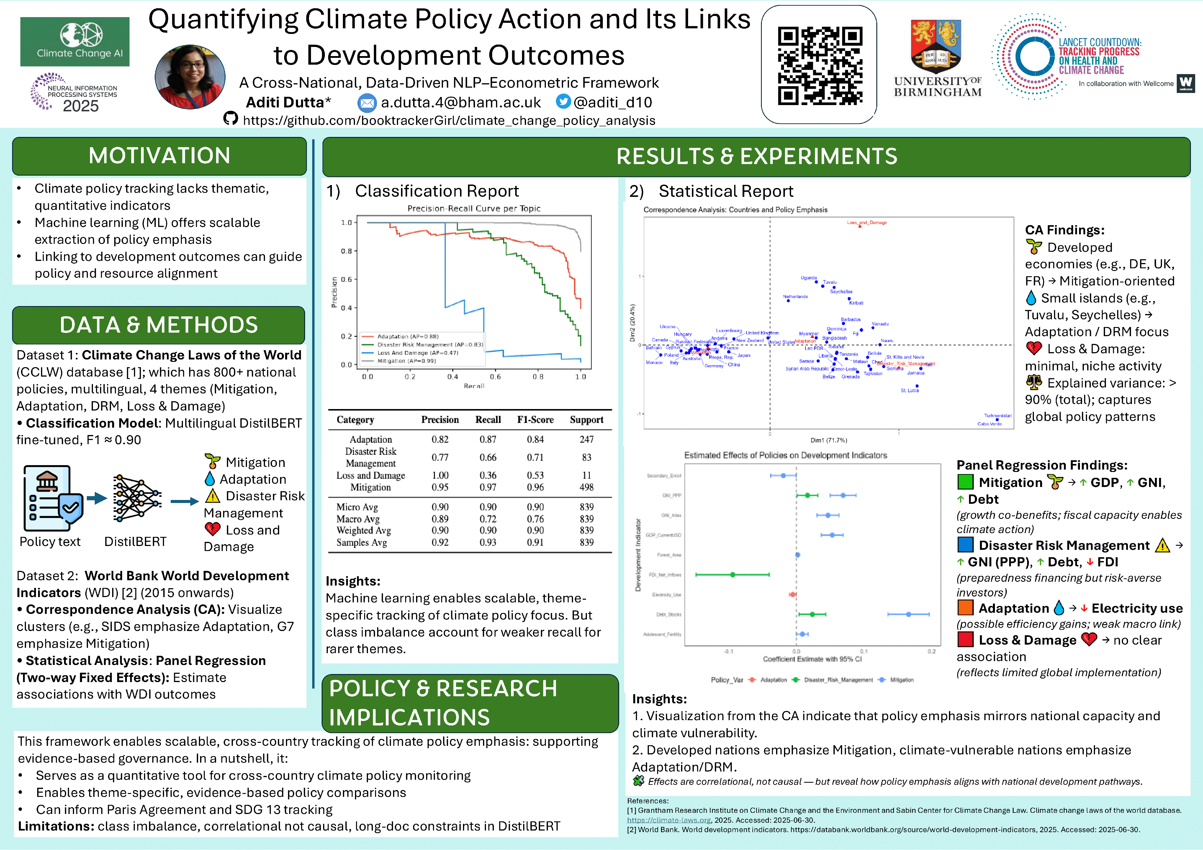 Addressing climate change effectively requires more than cataloguing the number of policies in place; it calls for tools that can reveal their thematic priorities and their tangible impacts on development outcomes. Existing assessments often rely on qualitative descriptions or composite indices, which can mask crucial differences between key domains such as mitigation, adaptation, disaster risk management, and loss and damage. To bridge this gap, we develop a quantitative indicator of climate policy orientation by applying a multilingual transformer-based language model to official national policy documents, achieving a classification accuracy of 0.90 (F1-score). Linking these indicators with World Bank development data in panel regressions reveals that mitigation policies are associated with higher GDP and GNI; disaster risk management correlates with greater GNI and debt but reduced foreign direct investment; adaptation and loss and damage show limited measurable effects. This integrated NLP-econometric framework enables comparable, theme-specific analysis of climate governance, offering a scalable method to monitor progress, evaluate trade-offs, and align policy emphasis with development goals.