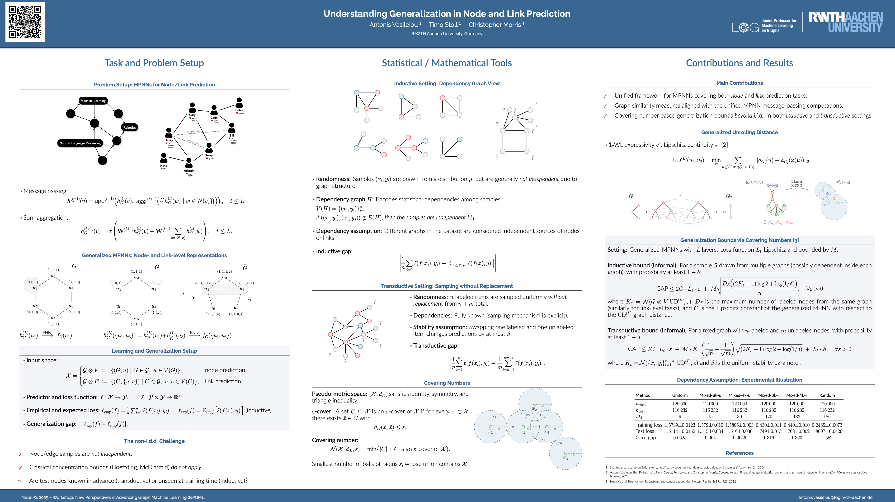 Using message-passing graph neural networks (MPNNs) for node and link prediction iscrucial in various scientific and industrial domains, which has led to the development ofdiverse MPNN architectures. Besides working well in practical settings, their ability togeneralize beyond the training set remains poorly understood. While some studieshave explored MPNNs’ generalization in graph-level prediction tasks, much lessattention has been given to node- and link-level predictions. Existing works often rely onunrealistic i.i.d. assumptions, overlooking possible correlations between nodes or links,and assuming fixed aggregation and impractical loss functions while neglecting theinfluence of graph structure. In this work, we introduce a unified framework to analyzethe generalization properties of MPNNs in inductive and transductive node and linkprediction settings, incorporating diverse architectural parameters and loss functions andquantifying the influence of graph structure. Additionally, our proposed generalizationframework can be applied beyond graphs to any classification task under the inductive ortransductive setting. Our empirical study supports our theoretical insights, deepening ourunderstanding of MPNNs’ generalization capabilities in these tasks.