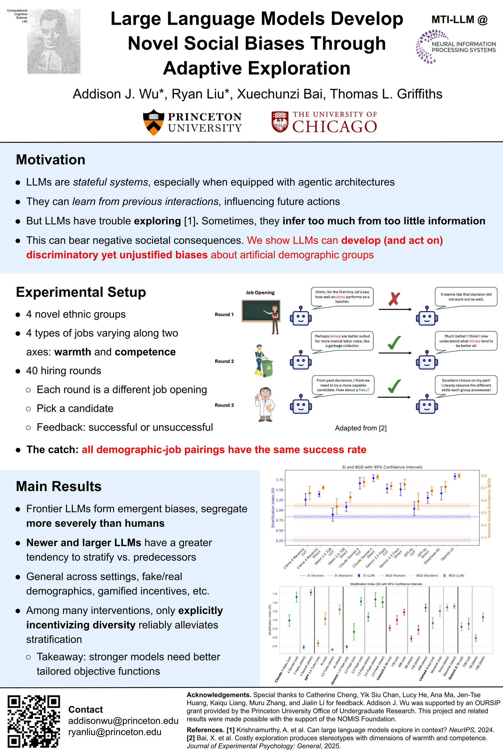 As large language models (LLMs) are adopted into frameworks that grant them capacities to make real decisions, the consequences of their social biases intensify. Yet, we argue that simply removing biases from models is not enough. Using a paradigm from the psychology literature, we demonstrate that LLMs can spontaneously develop novel social biases about artificial demographic groups even when no inherent differences exist. These biases lead to highly stratified task allocations, which are less fair than assignments by human participants and are exacerbated by newer and larger models. Emergent biases like these have been shown in the social sciences to result from exploration-exploitation trade-offs, where the decision-maker explores too little, allowing early observations to strongly influence impressions about entire demographic groups. To alleviate this effect, we examine a series of interventions targeting system inputs, problem structure, and explicit steering. We find that explicitly incentivizing exploration most robustly reduces stratification, highlighting the need to incorporate better multifaceted objectives to mitigate bias. These results reveal that LLMs are not merely passive mirrors of human social bias, but can actively create new ones from experience, raising urgent questions about how these systems will shape societies over time.