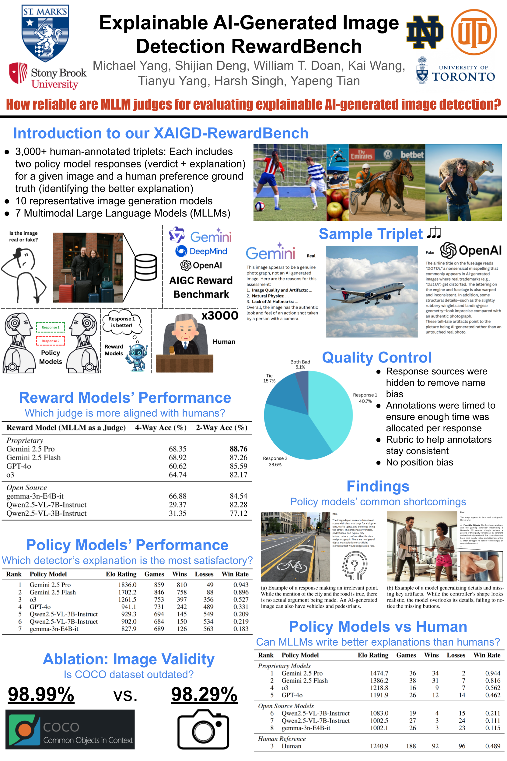Generative models now power large portions of the creative pipeline, but the same capabilities enable image forgeries that erode provenance, mislead audiences, and threaten creators’ rights. Protective AI therefore needs detectors that explain why an image is real or AI-generated in language people can trust, and crucially, reliable judges that can score the quality of those explanations at scale. We introduce XAIGID-RewardBench, a domain-specific benchmark for evaluating multimodal reward models (“MLLM-as-a-judge”) on the task of assessing explanations for AI-generated image detection. The benchmark contains ~3000 human-verified triplets (image, two competing explanations), spanning recent generators and real images, and is designed to stress artifact-aware, evidence-grounded reasoning. On XAIGID-RewardBench, the best current model attains 88.76\% accuracy on clear-winner cases, while human inter-annotator agreement reaches 98.30\%, revealing a sizable reliability gap. We analyze frequent failure modes (e.g., generalizing over localized artifacts, unsupported claims) and discuss how better judges can strengthen content provenance pipelines and platform governance. Code and data will be released upon acceptance.