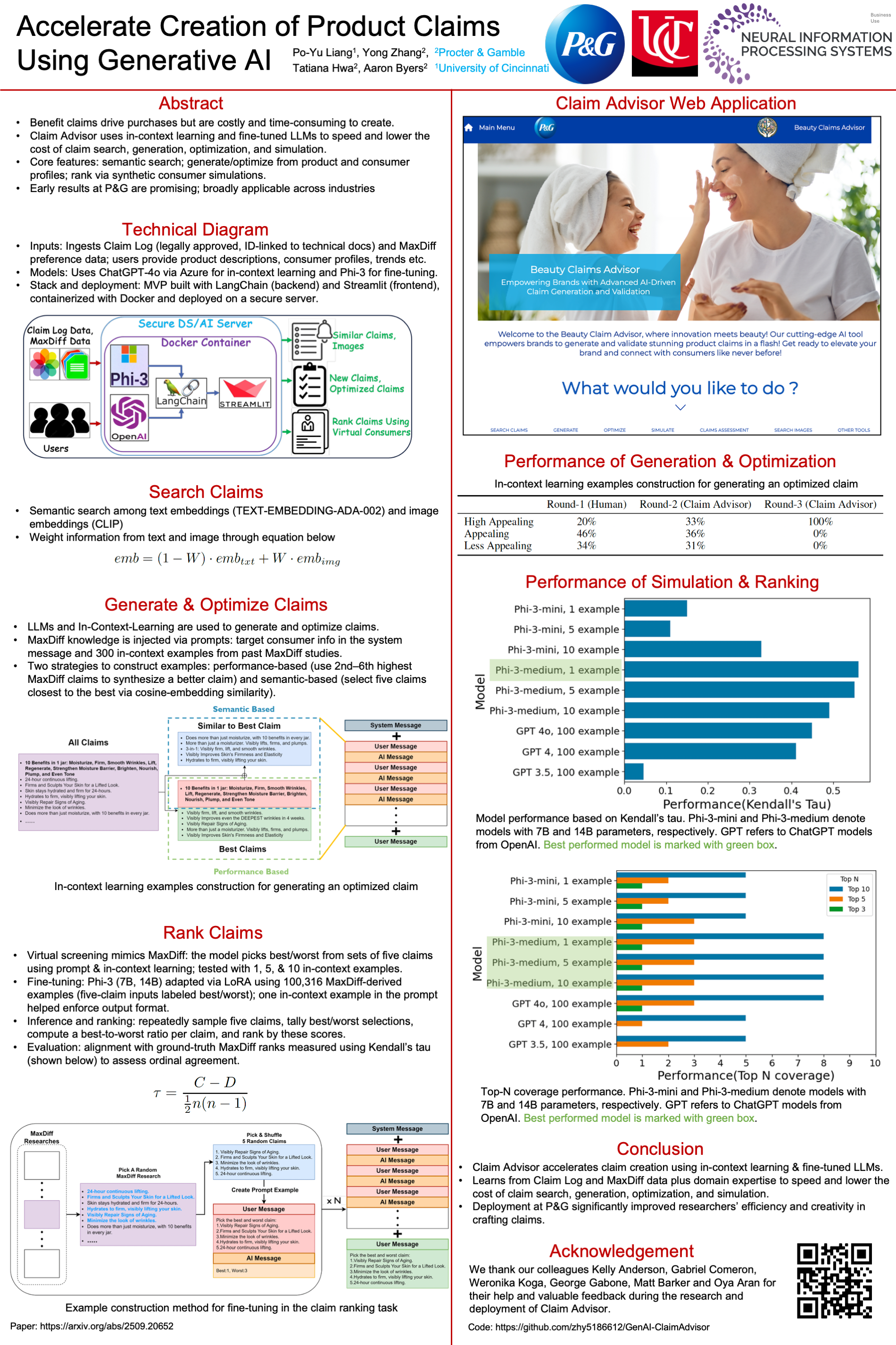 The benefit claims of a product is a critical driver of consumers' purchase behavior. Creating product claims is an intense task that requires substantial time and funding. We have developed the $\textbf{Claim Advisor}$ web application to accelerate claim creations using in-context learning and fine-tuning of large language models (LLM). $\textbf{Claim Advisor}$ was designed to disrupt the speed and economics of claim search, generation, optimization, and simulation. It has three functions: (1) semantically searching and identifying existing claims and/or visuals that resonate with the voice of consumers; (2) generating and/or optimizing claims based on a product description and a consumer profile; and (3) ranking generated and/or manually created claims using simulations via synthetic consumers. Applications in a consumer packaged goods (CPG) company have shown very promising results. We believe that this capability is broadly useful and applicable across product categories and industries. We share our learning to encourage the research and application of generative AI in different industries.