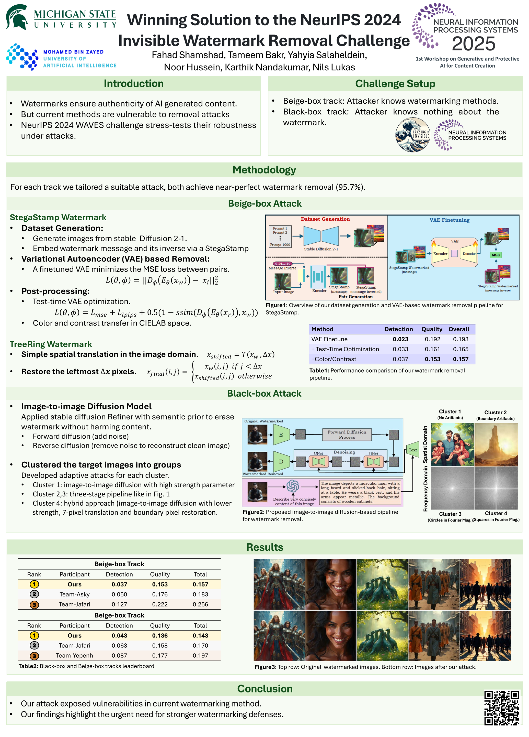 Content watermarking is an important tool for the authentication and copyright protection of digital media. However, it is unclear whether existing watermarks are robust against adversarial attacks. We present the \textbf{winning solution} to the NeurIPS 2024 \textit{Erasing the Invisible} challenge, which stress-tests watermark robustness under varying degrees of adversary knowledge. The challenge consisted of two tracks: a black-box and beige-box track, depending on whether the adversary knows which watermarking method was used by the provider. For the \textbf{beige-box} track, we leverage an \textit{adaptive} VAE-based evasion attack, with a test-time optimization and color-contrast restoration in CIELAB space to preserve the image's quality. For the \textbf{black-box} track, we first cluster images based on their artifacts in the spatial or frequency-domain. Then, we apply image-to-image diffusion models with controlled noise injection and semantic priors from ChatGPT-generated captions to each cluster with optimized parameter settings. Empirical evaluations demonstrate that our method successfully \textbf{achieves near-perfect watermark removal} (95.7\%) with negligible impact on the residual image's quality.We hope that our attacks inspire the development of more robust image watermarking methods.