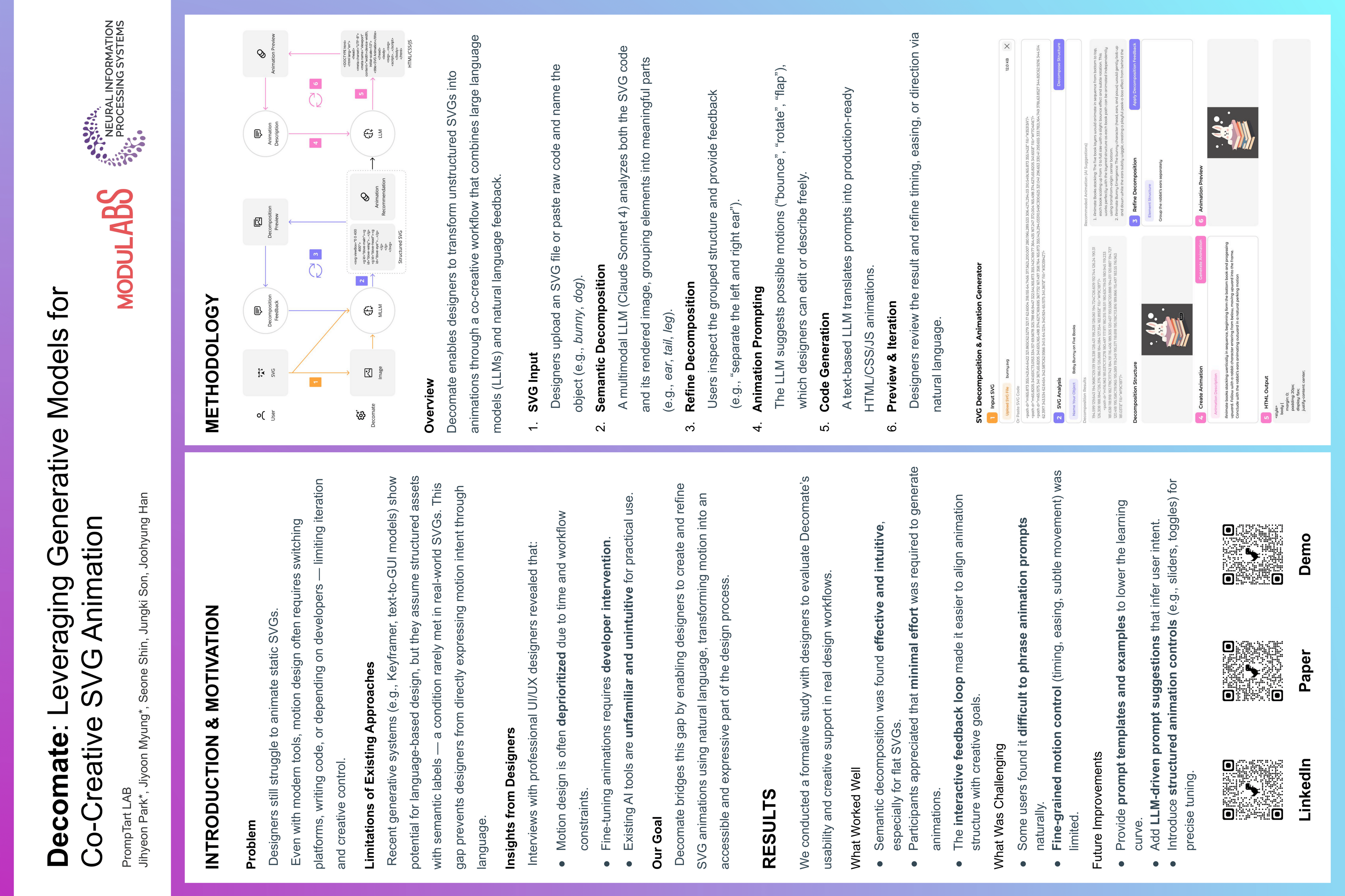 Designers often face friction when attempting to animate static SVG graphics, particularly when the visual structure does not align with the intended motion granularity. Existing tools typically rely on predefined groupings or require technical fluency, limiting designers’ ability to experiment and iterate independently. We present Decomate, a system that enables intuitive SVG animation through natural language. Decomate first uses a large language model (LLM) to restructure raw SVGs into semantically meaningful, animation-ready components. Designers can then assign motion to each component via text prompts, and the system generates corresponding HTML/CSS animations. Decomate brings generative AI into creative workflows by enabling iterative refinement through natural language based on user intent.