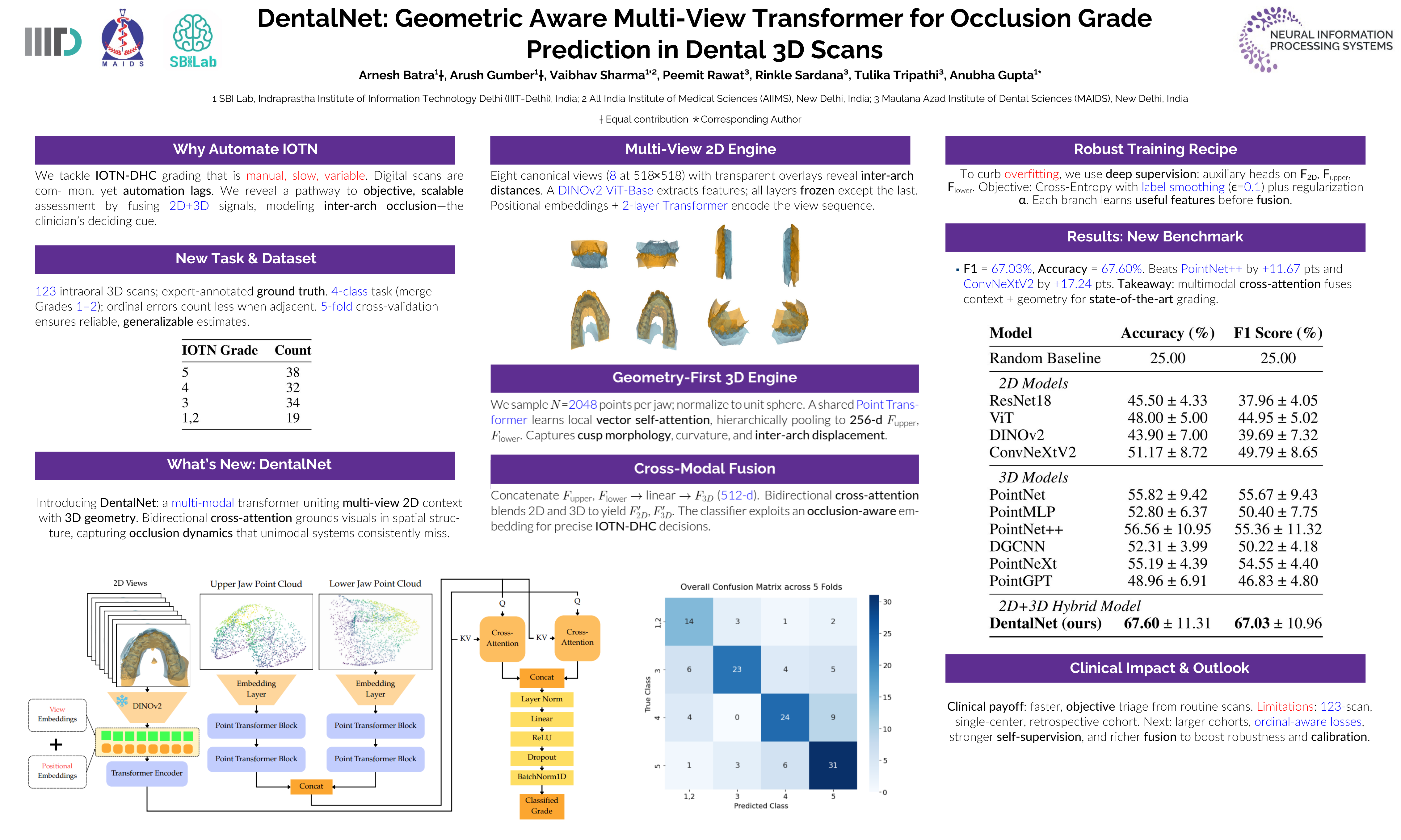 The assessment of orthodontic treatment need, standardized by the Index of Orthodontic Treatment Need (IOTN), is a cornerstone of clinical dentistry. The conventional workflow for grading its Dental Health Component (DHC) is a laborious process where 3D intraoral scans are physically printed for manual measurement of geometric discrepancies, introducing significant delays and potential for inter-examiner variability. To overcome this, we formulate the task of automated IOTN-DHC classification directly from 3D dental models.Furthermore, we conduct a study of retrospectively collected real clinical cases, with ground truth labels annotated by an orthodontic specialist, to serve as the benchmark for this problem.We propose DentalNet, a multi-modal deep learning architecture which fuses information from 2D rendered views and 3D point clouds. It achieves this by integrating a Vision Transformer for visual context and a Point Transformer for precise geometry, via a cross-attention mechanism to learn the critical inter-arch relationships that define malocclusion. On our 4-class classification task, DentalNet outperforms the state-of-the-art models' achieving a mean F1-score of 67.03\% which significantly surpasses the best performing 2D and 3D baselines i.e. Convnextv2 (49.79\%) and PointNet++ (55.36\%) demonstrating the utility of our multimodal approach.