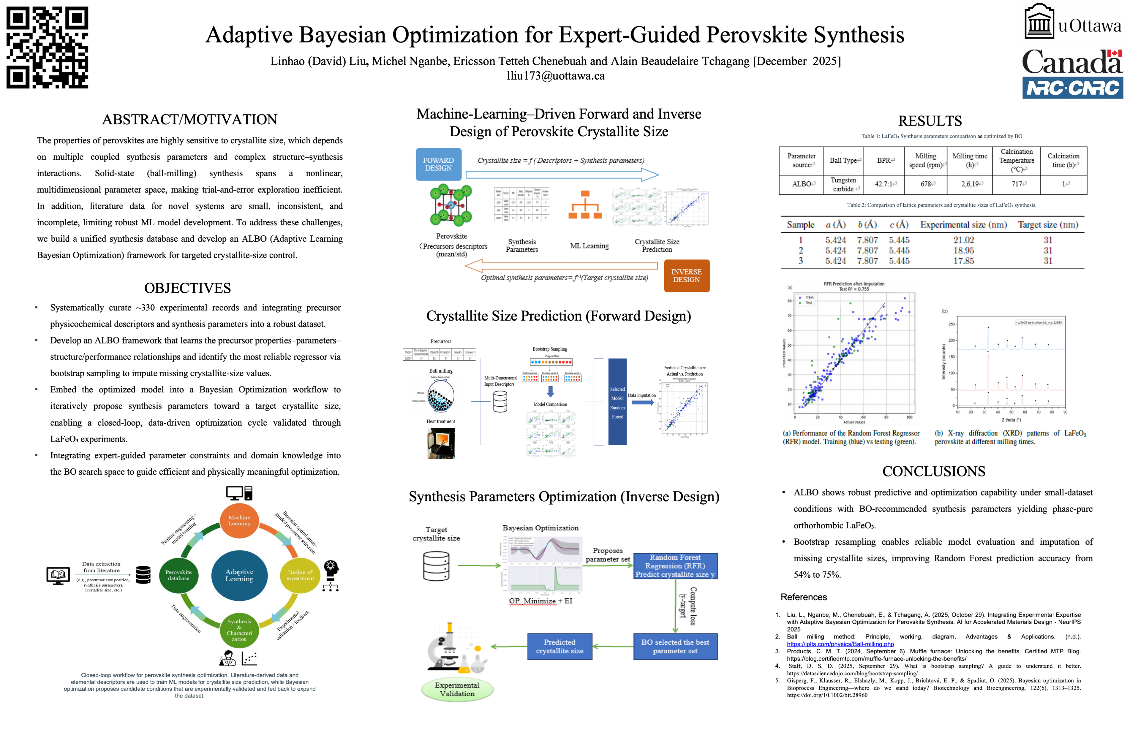 The ball milling synthesis of perovskite materials involves exploring a complex, high-dimensional parameter space, where conventional trial-and-error approaches are inefficient. For novel systems, large-scale prior datasets are often unavailable and may introduce bias if over-relied upon. In perovskite synthesis, the representation of process parameters and precursor descriptors plays a decisive role in the performance of predictive models and optimization strategies. To address this challenge, we propose a machine learning (ML)-guidedBayesian optimization (BO) framework for adaptive experimental design to accelerate the optimization of perovskite synthesis parameters. The framework integrates physicochemical descriptors of precursor elements with ball-millingă and heat-treatment variables to construct a crystallite-size prediction model, which is embedded into a BO loop to dynamically guide experiments toward target crystallite sizes. This enables systematic control and fine-tuning of crystallite size, representing a performance-oriented reverse design paradigm. Preliminaryresults show that the framework converges to optimal conditions within only a few experimental iterations, significantly outperforming traditional trial-and-error methods. Combining ML with BO effectively reduces the experimental search space, lowers costs, and accelerates materials synthesis. The proposed framework provides a promising pathway for intelligent, data-driven synthesis of perovskites and complex inorganic materials, laying the methodological foundation for future self-driving experimental work.