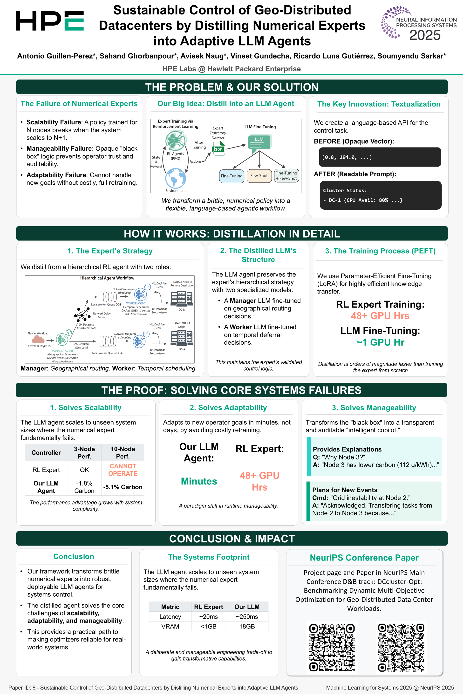 The sustainable control of geo-distributed datacenters is a critical systems challenge, defined by large-scale, dynamic, and uncertain operating conditions. While specialized numerical experts, such as those from Reinforcement Learning (RL) or Model Predictive Control (MPC), can be trained to find optimal control policies, their practical deployment is blocked by fundamental systems-level flaws: they are brittle, failing to scale with the system; opaque, preventing operator trust; and rigid, unable to adapt to new runtime objectives.This paper introduces a novel framework that directly addresses these issues by distilling the policy of a numerical expert into an adaptive LLM agent. Our method transforms the expert's opaque logic into a transparent, interactive, and agentic workflow. To validate this approach, we distill a state-of-the-art RL policy for carbon-aware workload orchestration.Evaluated in a high-fidelity simulation, our resulting LLM agent demonstrates the capabilities essential for real-world systems deployment. It solves the scalability problem, successfully managing topologies more than three times larger than the expert's training environment. It enables true runtime adaptability, altering its strategy in minutes in response to complex operator commands that would require days of costly retraining for the original expert. By making powerful optimizers manageable and resilient, our work offers a practical pathway to the sustainable control of large-scale computer systems.