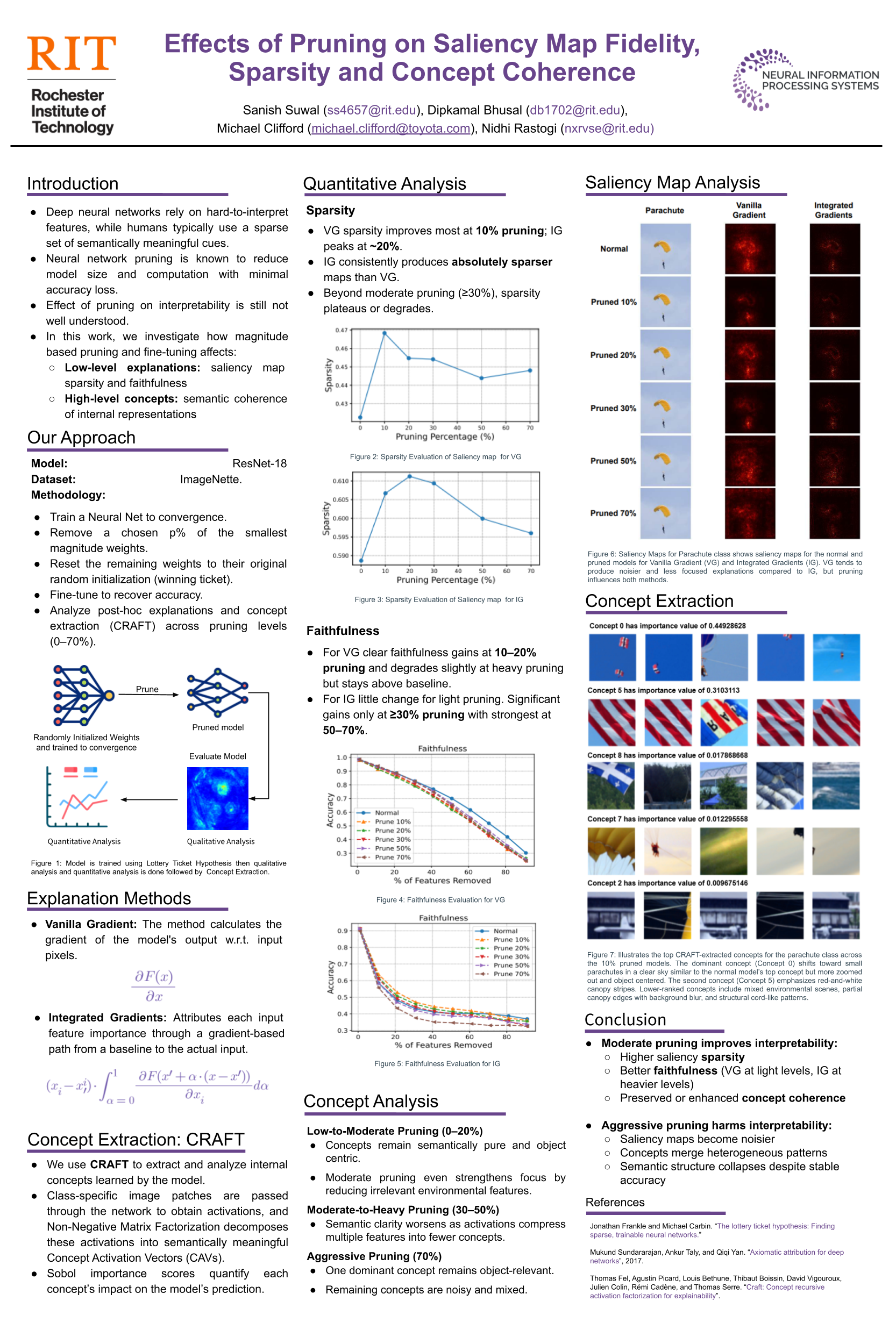 Prior works have shown that neural networks can be heavily pruned while preserving performance, but the impact of pruning on model interpretability remains unclear. In this work, we investigate how magnitude-based pruning followed by fine-tuning affects both low-level saliency maps and high-level concept representations. Using a ResNet-18 trained on ImageNette, we compare post-hoc explanations from Vanilla Gradients (VG) and Integrated Gradients (IG) across pruning levels, evaluating sparsity and faithfulness. We further apply CRAFT-based concept extraction to track changes in semantic coherence of learned concepts. Our results show that light-to-moderate pruning improves saliency-map focus and faithfulness while retaining distinct, semantically meaningful concepts. In contrast, aggressive pruning merges heterogeneous features, reducing saliency map sparsity and concept coherence despite maintaining accuracy. These findings suggest that while pruning can shape internal representations toward more human-aligned attention patterns, excessive pruning undermines interpretability. Code is available at \url{https://github.com/sanishsuwal7/Neurips-CogInterp/}.