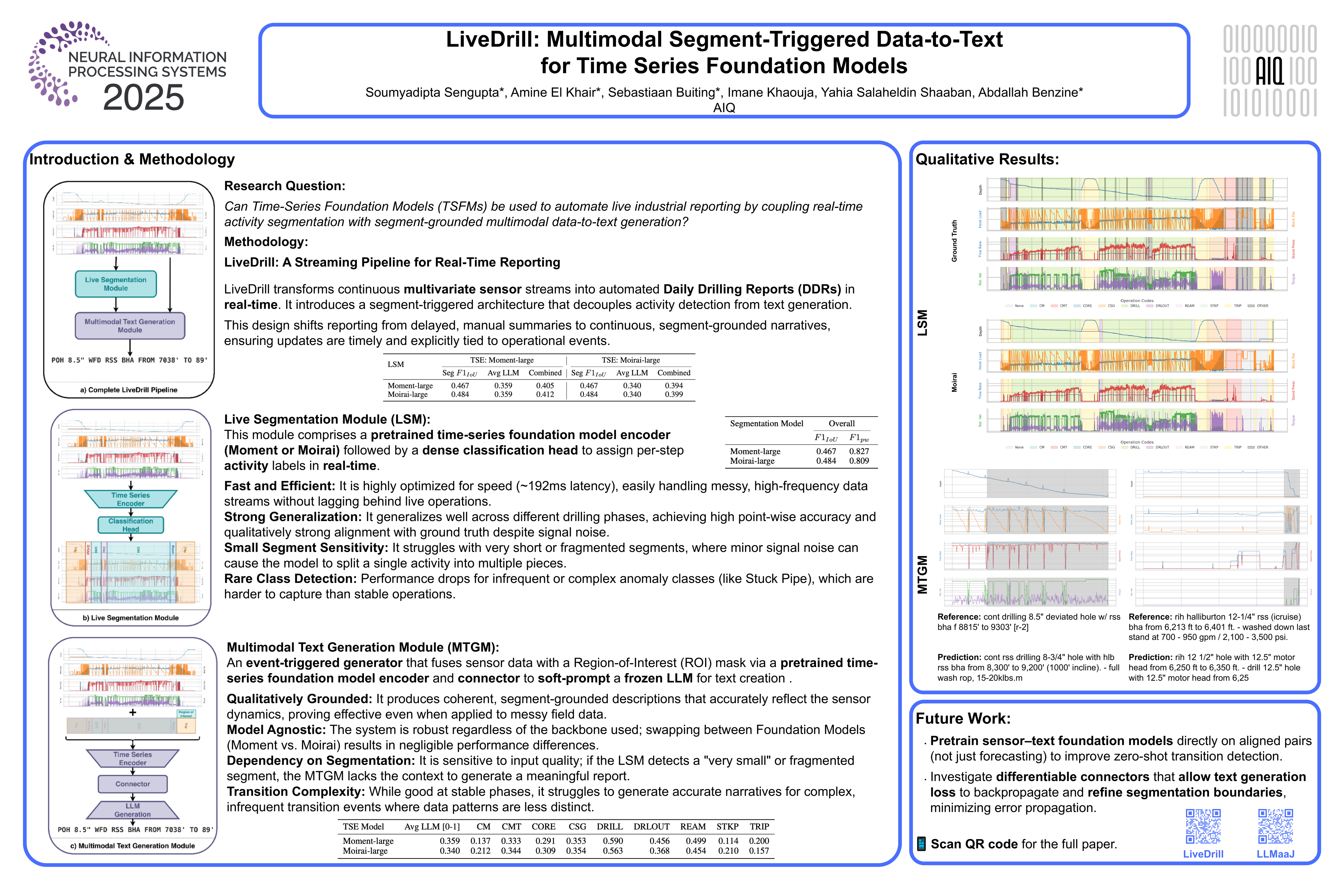 Time-series foundation models show strong results on static benchmarks, but their potential in live industrial reporting is only beginning to be explored. In drilling, continuous multivariate sensor streams must be transformed into Daily Drilling Reports (DDRs), where each entry aligns with activity boundaries. Automating this process offers an opportunity to deliver reports that are both timely and consistent, reducing the burden of manual compilation. We present \textbf{LiveDrill}, a streaming pipeline for \textbf{multimodal segment-grounded data-to-text generation}. LiveDrill integrates two modules: a \textbf{Live Segmentation Module} that detects activity transitions in real time, and a \textbf{Multimodal Text Generation Module} that conditions report entries on both sensor signals and the detected segments. This design ensures that generated text is explicitly tied to operational intervals, providing structured updates directly from live data. Evaluation on large-scale field data demonstrates that LiveDrill can reliably capture stable operations and generate coherent DDR entries. Segment-level metrics reveal the sensitivity of boundary detection, highlighting areas where further improvement can yield even stronger results. Overall, LiveDrill demonstrates the feasibility of segment-grounded, multimodal reporting in industrial settings. It opens the door for adapting TSFMs beyond static benchmarks toward practical, boundary-sensitive applications where live sensor data must be translated into actionable narratives.