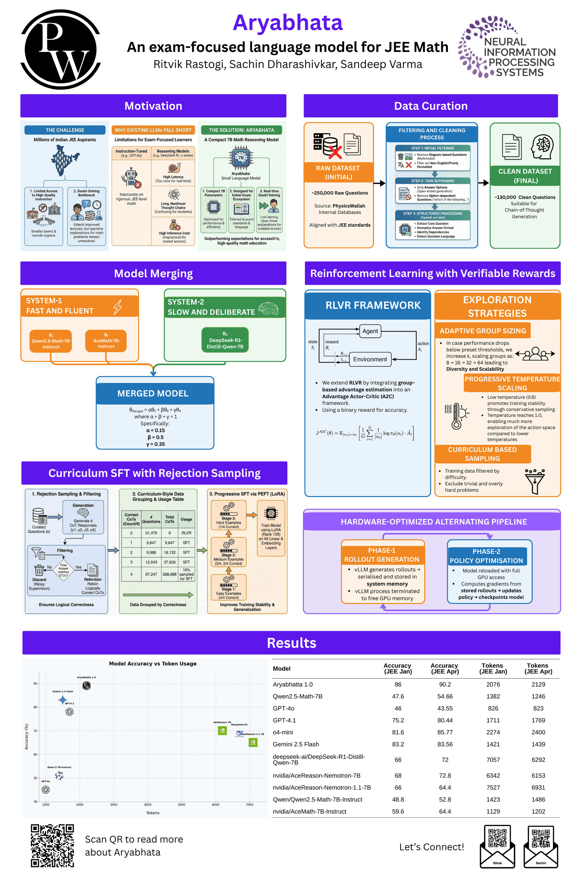 We present $\textbf{Aryabhata 1.0}$, a 7B parameter math reasoning model optimized for the Indian Joint Entrance Examination (JEE). While recent LLMs have advanced mathematical reasoning, many remain unsuitable for high-stakes educational use. Our model is created by merging strong open-weight reasoning backbones, followed by supervised fine-tuning with curriculum learning on verified chain-of-thought (CoT) traces obtained through best-of-$n$ rejection sampling. We further enhance performance via reinforcement learning with verifiable rewards (RLVR) using an A2C objective with group-relative advantage estimation, along with novel exploration strategies including $\textit{Adaptive Group Resizing}$ and $\textit{Temperature Scaling}$. Evaluated on in-distribution (JEE Main 2025) and out-of-distribution (MATH, GSM8K) benchmarks, the model surpasses comparable baselines in accuracy and efficiency, while producing pedagogically useful step-by-step reasoning. This work demonstrates that compact, exam-focused language models can deliver both strong performance and practical usability for educational contexts.
