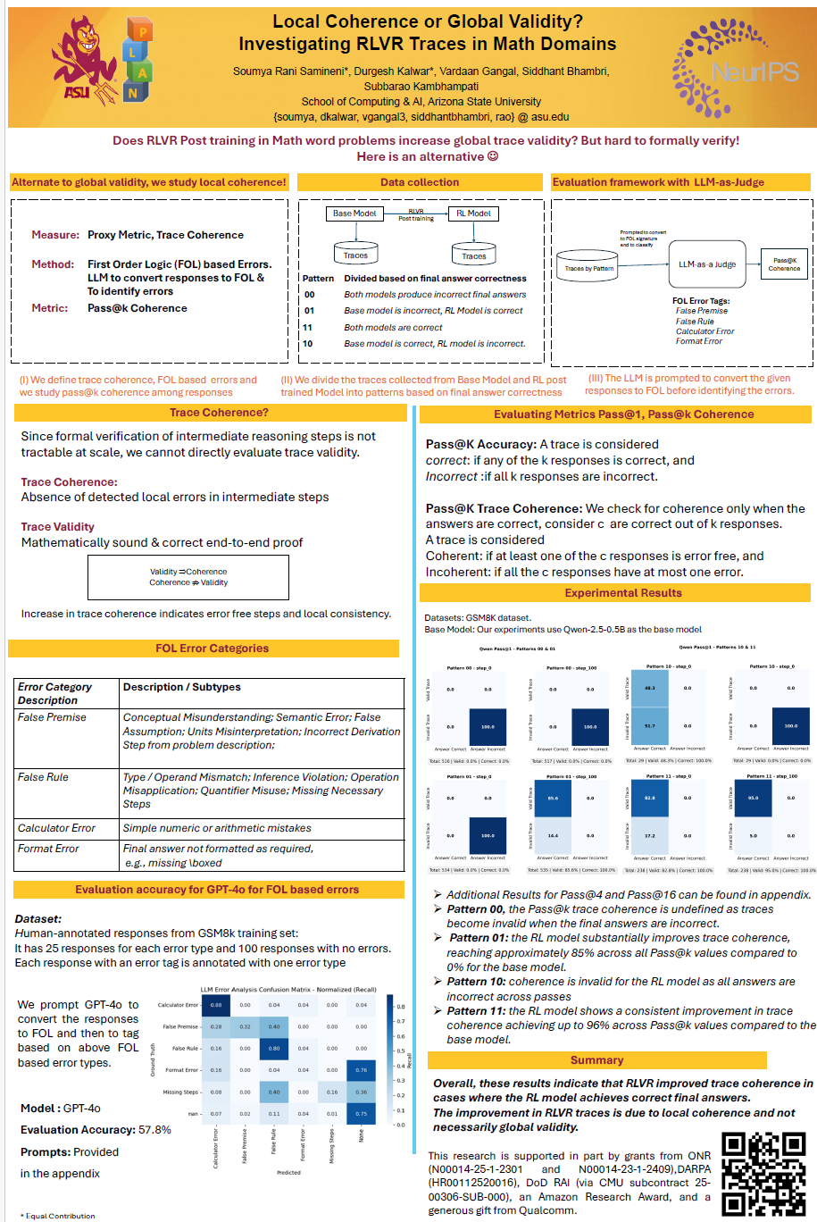 Reinforcement Learning with Verifiable Rewards (RLVR)-based post-training of Large Language Models (LLMs) has been shown to improve accuracy on reasoning tasks and continues to attract significant attention. Existing RLVR methods, however, typically treat all tokens uniformly without accounting for token-level advantages. These methods primarily evaluate performance based on final answer correctness or Pass@K accuracy, and yet make claims about RL post-training leading to improved reasoning traces. This motivates our investigation into the effect of RL post-training on intermediate tokens which are not directly incentivized. To study this, we design an experimental setup using the GRPO algorithm with Qwen-2.5-0.5B model on the GSM8K dataset. We introduce trace coherence, a First-Order Logic (FOL)-based measure to capture the consistency of reasoning steps by identifying errors in the traces. We distinguish between trace validity and trace coherence, noting that the former implies logical soundness while the latter measures local coherence via lack of errors. Our results show that RL post-training overall improves trace coherence with the most significant gains on problems where the base model fails but the RL model succeeds. Surprisingly, RL enhances local coherence without necessarily producing valid or correct solutions. This highlights a crucial distinction: improved local coherence in reasoning steps does not guarantee final answer correctness. We argue that claims of improved reasoning via RL must be examined with care, as these may be based on improved trace coherence, which may not translate into fully valid mathematical proofs.