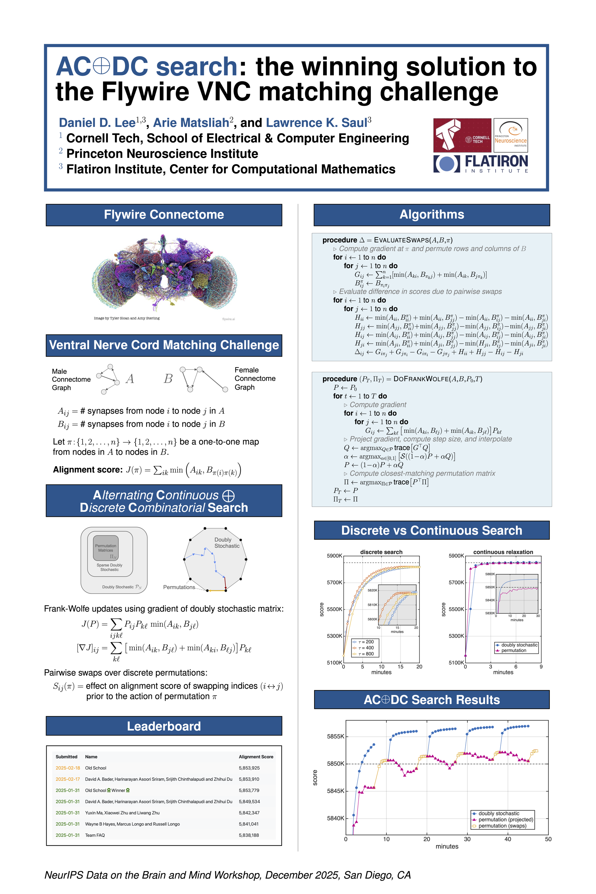 This paper describes the $A$lternating $C$ontinuous and $D$iscrete $C$ombinatorial (AC$\oplus$DC) optimizations behind the winning solution to the FlyWire Ventral Nerve Cord Matching Challenge. The challenge was organized by the Princeton Neuroscience Institute and held over three months, attracting research teams with expertise in machine learning, high-performance computing, graph data mining, biological network analysis, and quadratic assignment problems. The goal of the challenge was to align the connectomes of a male and female fruit fly, and more specifically, to determine a one-to-one correspondence between the neurons in their ventral nerve cords. The connectomes were represented as large weighted graphs, and the challenge was posed as a problem in graph matching, or finding a permutation that maps the nodes of one graph onto the nodes of another. The winning solution to the challenge alternated between two complementary approaches to graph matching--the first, a combinatorial optimization over the symmetric group of permutations, and the second, a continuous relaxation of this problem to the space of doubly stochastic matrices that is amenable to Frank-Wolfe methods. We provide a complete implementation of these methods in MATLAB; with only a few hundred lines of code, it is able to obtain a winning score to the challenge in less than 15 minutes on a laptop computer.
