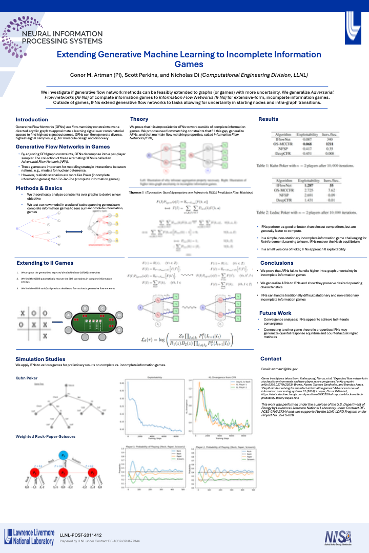 While many algorithms blend reinforcement learning (RL) with counterfactual regret (CFR) methods to leverage tradeoffs in computational speed and performance, there are fewer investiga- tions into generative sampling frameworks in game theoeretic applications in incomplete informa- tion games. We extend a generative flow network framework, Adversarial Flow Networks (AFNs), to incomplete information games, called Information Flow Networks (IFNs). We prove that pre- viously established constraints for generative flow networks in complete information games are inadmissible for obtaining valid densities (corresponding to player strategies) and a valid training objective. We show that our proposed generalization, IFlowNets, alleviates this issue and strictly generalizes AFlowNets. In preliminary results for three standard game environments, IFlowNets perform comparably to or better than OS-MCCFR and standard RL-based methods in performance and speed.