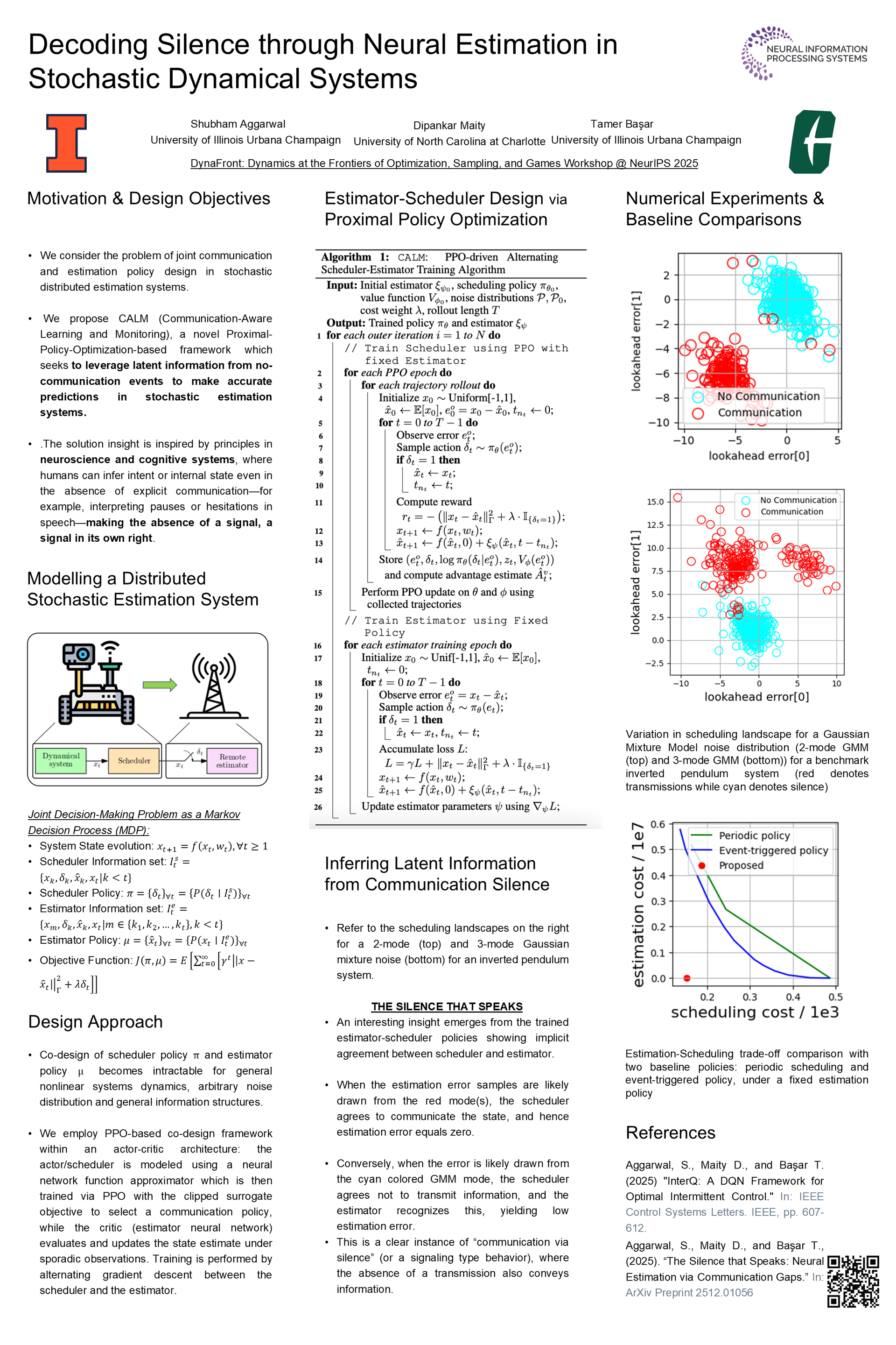 Accurate remote state estimation is a fundamental component of many autonomous and networked dynamical systems, where multiple decision-making agents (for instance, a scheduler and an estimator) interact and communicate over shared, bandwidth-constrained channels. These communication constraints introduce an additional layer of complexity, namely, the decision of when to communicate. This results in a fundamental trade-off between estimation accuracy and communication resource usage. Traditional extensions of classical estimation algorithms (e.g., the Kalman filter) treat the absence of communication as ‘missing’ information. However, silence itself can carry implicit information about the system’s state, which, if properly interpreted, can enhance the estimation quality even in the absence of explicit communication. Leveraging this implicit structure, however, poses significant analytical challenges, even in relatively simple systems. In this paper, we propose CALM (Communication-Aware Learning and Monitoring), a novel learning-based framework that jointly addresses the dual challenges of communication scheduling and estimator design. Our approach entails learning not only when to communicate but also how to infer useful information from periods of communication silence. Our case study on a control system benchmark demonstrates that CALM is able to decode the implicit coordination between the estimator and the scheduler to extract information from the instances of ‘silence’ and enhance the estimation accuracy.
