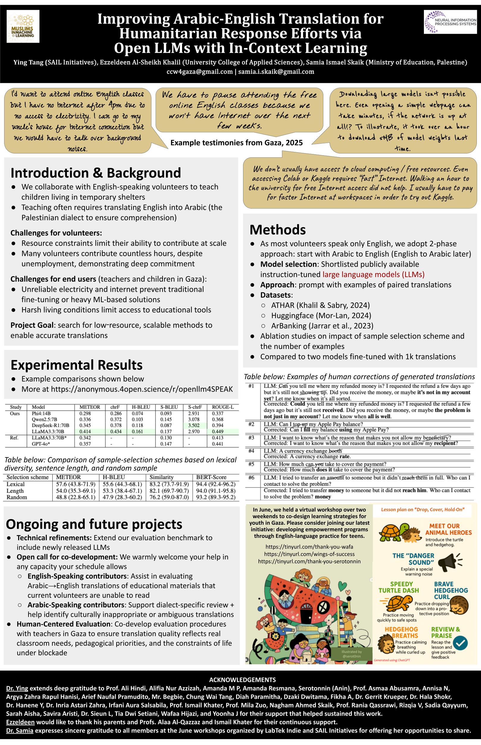 A key step in humanitarian relief in low-resource settings is making translation tools easily accessible. Once validated, these tools enable improved access to educational materials, healthcare information, and other essential resources. Many existing Arabic-to-English translation services require Internet access or paid subscriptions, while non-proprietary approaches typically require powerful computers, which are often infeasible for communities with limited or unreliable connectivity and electricity. This study advocates a non-proprietary approach based on open-weight large language models and in-context learning, a strategy that enables these models to learn from a few examples without expensive retraining of models. We tested various open-weight models, including Meta’s LLaMA3.3, Google’s Gemma2, and Alibaba’s Qwen2.5, to evaluate their Arabic-to-English translation performance. According to various quantitative metrics, our experimental results show that using 3 to 15 examples progressively enhanced translations accuracy, and that using the entire training corpus to fine-tune commonly used models did not yield performance gains. Additional subjective evaluations by native speakers revealed limitations that may be addressed by including examples of idiomatic expressions and other colloquial data. By identifying effective and lightweight translation tools, this work contributes to the development of digital tools that can support long-term recovery and resilience-building efforts in Gaza. To make our experiments accessible to the community, our analysis scripts will be continuously updated and made available at https://anonymous.4open.science/r/openllm4SPEAK.