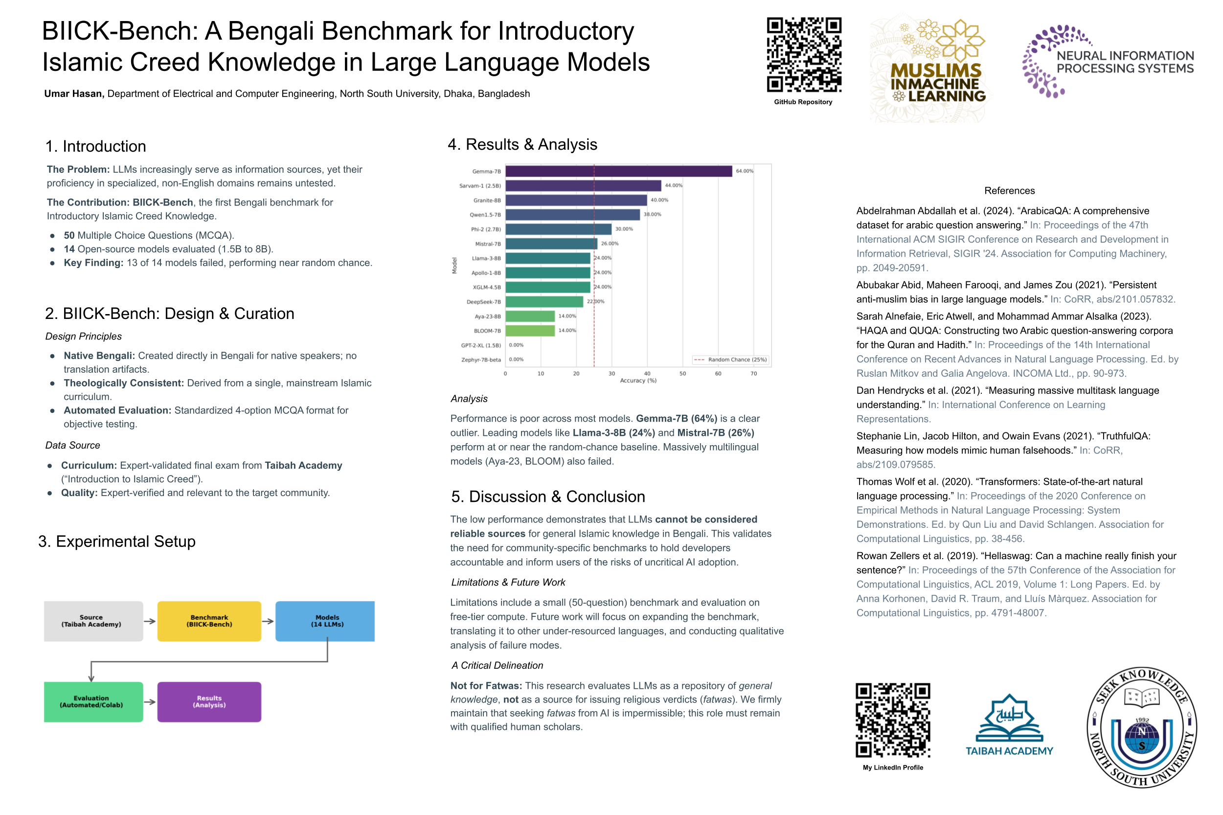 Large Language Models (LLMs) are increasingly used as information sources globally, yet their proficiency in specialized domains for non-English speakers remains critically under-evaluated. This paper introduces the Bengali Introductory Islamic Creed Knowledge Benchmark (BIICK-Bench), a novel, 50-question multiple-choice benchmark in the Bengali language, designed to assess the foundational Islamic knowledge of LLMs. Crucially, this work is an evaluation of knowledge retrieval and does not endorse seeking religious verdicts (fatwas) from LLMs, a role that must remain with qualified human scholars. Addressing the digital language divide, BIICK-Bench provides a vital tool for the world's second-largest Muslim linguistic community. Fourteen prominent open-source LLMs were evaluated, ranging from 2.5B to 8B parameters. The fully automated evaluation reveals a stark performance disparity, with accuracy scores ranging from 0\% to a high of 64\%. The results underscore that even state-of-the-art models struggle with Bengali Islamic knowledge, highlighting the urgent need for culturally and linguistically specific benchmarks to ensure the safe and reliable use of AI in diverse communities.