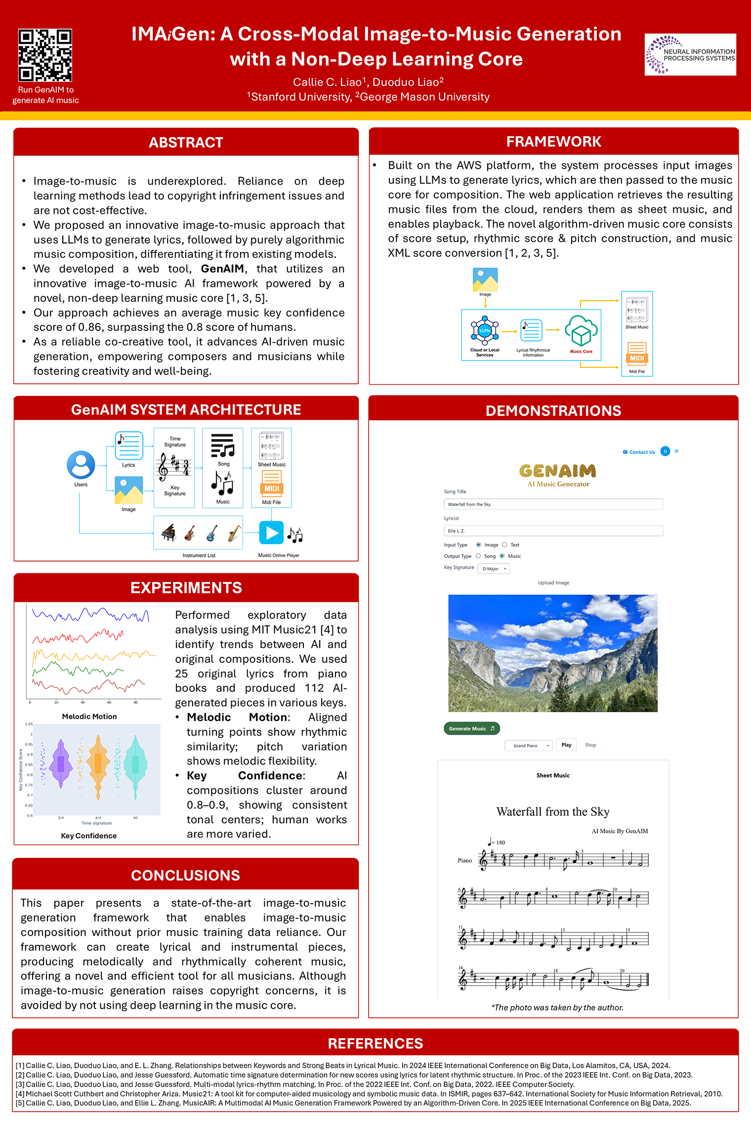 Artificial Intelligence Generated Content (AIGC) has grown rapidly, particularly with tools like ChatGPT. However, AI music generation lags behind AI art and writing due to its complex structure and required musical expertise. Current methods rely on deep learning, using large datasets for music generation, but face challenges including data collection and preparation, copyright risks, and high computing costs. In developing a musically robust song generation method, knowledge of music theory, literature, and linguistics is required to emulate the intuitive thinking process of musical artists while not relying on existing music to train and develop such algorithms. Therefore, we propose a novel cross-modal Image-to-Music Artificial intelligence Generation (IMA$_{i}$Gen) framework driven by an innovative non-deep learning music core. This music core takes in lyrical rhythmic information derived from images and purely utilizes novel algorithms while leveraging correlations between lyrics and music, as inspired by [1][2]. We developed a web tool, GenAIM, that allows users, regardless of their expertise, to generate music with customizable features such as key signatures, instruments, and sheet music display as shown in Figure 1. As a reliable co-pilot for composers and entertainment, this unique copyright-free approach to AI non-lyrical music generation from images combines latent rhythms, melodies, music theory, and composer intuition to create natural, human-sounding music that bridges visual and auditory art forms across modalities. In the framework, different images are inputted into Large Language Models (LLMs) to automatically generate Lyrical Rhythmic Information (LRI) of multiple phrases. Preference prompts are added to customize the generated lengths before the LRI is employed to construct the rhythmic score. LRI is extracted to determine the time signature [3]. Phrases are identified through punctuation with accents and keywords influencing the total number of measures. Keywords are then inserted into stressed beats within each measure following the order specified by the lyrics. During the pitch construction, the insertion processes work in a feedback loop, with randomly generated pitches adapted to music theory before being refined for smoother transitions and varied phrasing. Upon generating the music, the architecture presents the results in a MIDI or MusicXML sheet music file format for better readability and compatibility. Our web tool, GenAIM, is built on the Amazon Web Services (AWS) platform, and displays and plays the sheet music. To evaluate the generated music, we used 20 distinct images and the corresponding 75 AI-generated pieces as well as key confidence, the measure of the central tonal tendency that is derived from a metric of music21 [4]. The average key confidence is at 85.3%, indicating a higher alignment of the key signatures with the generated melodies. Figure 2 displays the results of two melodic smoothness metrics. A higher step ratio and a moderate direction change rate that corresponds to a smoother melody further shows that overall, our approach produces diverse, human-like compositions.