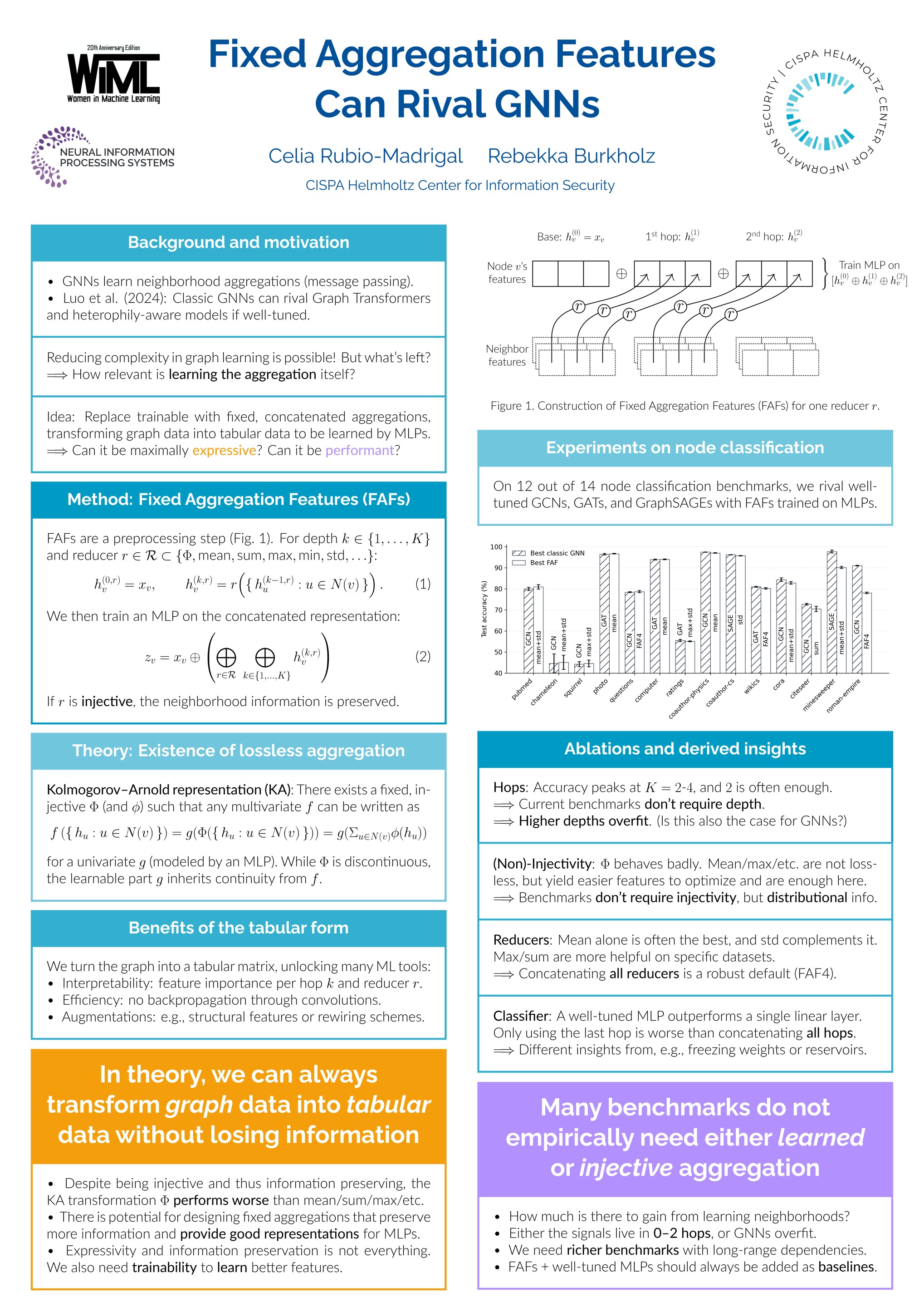 Graph neural networks have become the standard approach for learning from relational data, with node classification as a central benchmark. Most models follow the message-passing paradigm, alternating neighborhood aggregation with learned linear combinations across multiple hops, achieving strong performance across domains ranging from social networks to biology. Yet, it comes at the cost of high model complexity that poses challenges for interpretation. We ask the question whether this high complexity is really necessary. Recent evidence [1] shows that classic models (GCN, GATv2, and GraphSAGE) remain surprisingly competitive when tuned with standard optimization techniques: learning rate, weight decay, width, depth, normalization, dropout, and residuals. When carefully tuned, they can rival graph transformers and heterophily-aware models. We take this architectural simplification further: we argue that learning the aggregation itself is theoretically unnecessary, and we empirically verify our hypothesis for node-classification tasks, where neighborhood distributions and feature diversity are often more informative for a task rather than the exact graph structure. Our approach, Fixed Aggregation Features (FAF), creates a tabular dataset comprising multi-hop summaries with fixed, label-agnostic reducers over neighborhoods up to depth $K$—chosen to match the best validation depth of competing models. Only a classifier, e.g. a MLP, is learned on top. Reducers $R=\{mean,sum,max,min\}$ recursively construct and concatenate ($\oplus$) features via $h_v^{(0)}=x_v$ and $h_v^{(k)}=\bigoplus_{r\in R}r(\{h_u^{(k-1)}:u\in N(v)\})$. MLP is trained as classifier of $z_v=[h_v^{(0)}\oplus \cdots\oplus h_v^{(K)}]$ with input dimensionality $|x_v|\cdot (1+|R|\cdot K)$ per node $v$. Note that this mimics the layerwise computation in GNNs. In general, it is not equivalent to taking powers of the adjacency matrix. We motivate FAF via the Kolmogorov-Arnold (KA) representation theorem [2], which states that any multivariate neighborhood function can be written as a univariate function applied to a {fixed} aggregation. For $d\ge2$ and scalar neighbor features $x_1,\ldots,x_d\in[0,1]$ there exists a monotone $\phi:[0,1]\to C$ (the Cantor set) such that any function $f:[0,1]^d\to\mathbb{R}$ can be written as a univariate $g$ applied to a fixed aggregation independent of $f$, i.e., $f(x_1,\ldots,x_d)=g\left(3\sum_{p=1}^d3^{-p}\phi(x_p)\right)$. $g$ even inherits the continuity properties of $f$. Accordingly, successive aggregation of learned embeddings is not required, as neighborhood information ($f$) can be compressed without learning ($\phi$) and processed by a feed-forward model ($g$)—lossless in principle, with the usual caveat of finite precision in practice. The GIN architecture [3] has been derived on the basis of a similar result for (permutation-invariant) multiset functions on countable feature spaces, yet, its layers still have to be learned. Although theory proposes information-preserving aggregators, good learnability and generalization are not guaranteed. We study feature embeddings that are practically feasible and performative. Empirically, FAF matches or surpasses classic GNNs across 12 out of 14 diverse node-classification benchmarks spanning citation, coauthor, and Amazon graphs, as well as heterophilous datasets. It trails only on Minesweeper and Roman-Empire, datasets whose best performing GNNs require linear residual connections; the remaining performance gap matches the benefit conferred by such residuals reported by [1]. This suggests they may need different aggregations per hop or interactions between consecutive layers; on these datasets, GNNs also benefit from deep message passing (10-15 layers). Because FAF produces tabular features, standard interpretability tools (e.g., feature importance) apply and reveal which hops and reducers matter, helping to distinguish homophily from heterophily, assessing the utility of individual reducers, and discovering long-range interactions. The tabular view also makes it natural to enrich the feature set with common network science descriptors (degree, centrality, communities), and neighborhood-masking features inspired by graph rewiring, all of which can improve robustness and reduce variance. In summary, we (i) provide a KA-based explanation that fixed, label-agnostic aggregation suffices in principle, removing the need to learn neighborhood embeddings; (ii) present a pipeline to turn graph learning into tabular learning via recursive fixed reducers and MLPs; (iii) demonstrate competitive performance across standard datasets, showing their limitations as benchmarks to meaningfully advance graph learning; and (iv) leverage the tabular formulation for straightforward interpretability of hop depth, aggregator choice, and the interplay of features, graph structure, and labels, thereby establishing a transparent, strong baseline for future graph learning research.