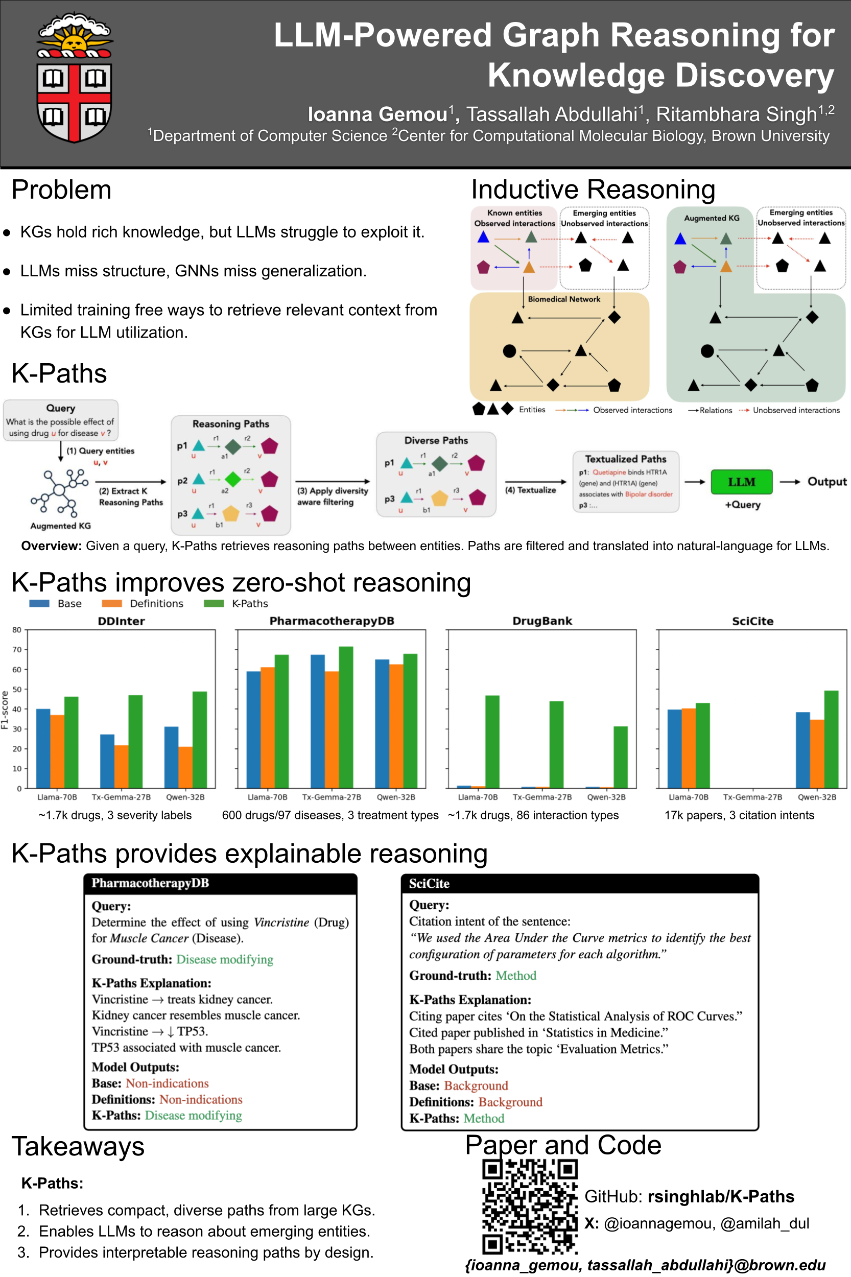 Knowledge graphs (KGs) encode structured relations between entities and are widely used for scientific discovery. Graph Neural Networks (GNNs) can effectively encode KGs for link prediction and relational modeling, but they are computationally expensive and do not generalize well to unobserved entities. Large language models (LLMs) excel at zero-shot reasoning and generalization to unseen data, but cannot directly process large KGs. Together, these limitations highlight key challenges in using large KGs for prediction tasks: (1) Scalability - their growing scale and continuous evolution with new entities make them computationally expensive to process and train on. (2) Generalization - most existing methods fail to handle previously unseen entities. These challenges motivate a central research problem: How can we extract compact, interpretable reasoning paths from large KGs so they can be effectively used by both GNNs and LLMs for prediction tasks? To address these problems, we introduce K-Paths, a training-free framework that retrieves diverse multi-hop reasoning paths between entities. It prunes the KG for task-specific interactions by applying a diversity-aware Yen’s algorithm to extract non-redundant paths. These paths are provided as subgraphs for GNNs or natural language descriptions for LLMs, reducing computation, enabling generalization to new entities, and offering interpretable reasoning evidence. We applied K-Paths to diverse biomedical and academic KGs. On drug–based prediction tasks, K-Paths yields large zero-shot gains for LLMs: Llama~3.1 8B improves from 14.7 to 47.0 F1-score on DDInter and from near-zero to 40.5 F1-score on DrugBank, while Tx-Gemma models gain +25–37 F1-score. For supervised GNNs, K-Paths cuts graph size by ~90% while preserving or improving accuracy, e.g., EmerGNN improves from 68.0 to 68.9 F1-score on DDInter, while training time drops by 83%. On citation intent classification tasks, K-Paths improves LLM F1-score by 6–13 points on SciCite, demonstrating cross-domain generalization. Qualitative results illustrate how K-Paths grounds predictions with reasoning evidence. In summary, K-Paths reduces the computational cost of large KGs, improves generalization to unseen entities, and provides human-readable reasoning paths for explainability. Future work includes better path scoring, joint retrieval–reasoning, and broader applications in scientific discovery.