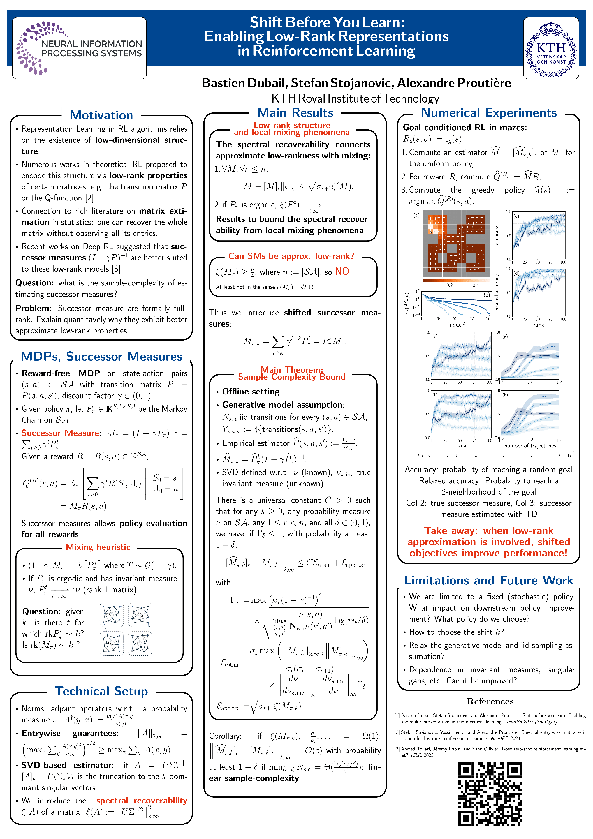 Low-rank structure is a common implicit assumption in many modern reinforcement learning (RL) algorithms. For instance, reward-free and goal-conditioned RL methods often presume that the successor measure admits a low-rank representation. In this work, we challenge this assumption by first remarking that the successor measure itself is not approximately low-rank. Instead, we demonstrate that a low-rank structure naturally emerges in the shifted successor measure, which captures the system dynamics after bypassing a few initial transitions. We provide finite-sample performance guarantees for the entry-wise estimation of a low-rank approximation of the shifted successor measure from sampled entries. Our analysis reveals that both the approximation and estimation errors are primarily governed by a newly introduced quantitity: the spectral recoverability of the corresponding matrix. To bound this parameter, we derive a new class of functional inequalities for Markov chains that we call Type II Poincaré inequalities and from which we can quantify the amount of shift needed for effective low-rank approximation and estimation. This analysis shows in particular that the required shift depends on decay of the high-order singular values of the shifted successor measure and is hence typically small in practice. Additionally, we establish a connection between the necessary shift and the local mixing properties of the underlying dynamical system, which provides a natural way of selecting the shift. Finally, we validate our theoretical findings with experiments, and demonstrate that shifting the successor measure indeed leads to improved performance in goal-conditioned RL.
